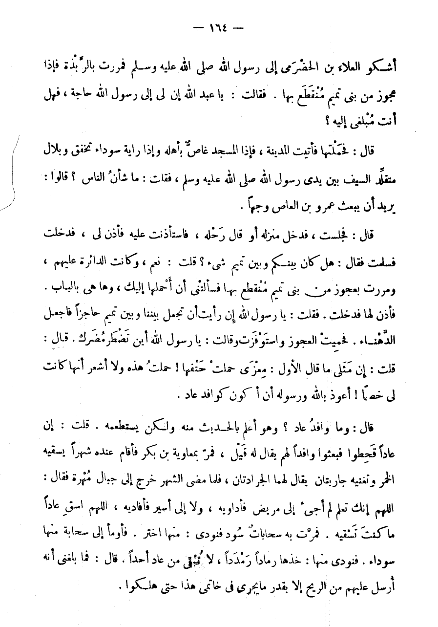 قَالَ: قُلْتُ: إِنَّ مِثْلِي مَا قَالَ الْأَوَّلُ: مِعْزًى حَمَلَتْ حَتْفَهَا! حَمَلْتُ هَذِهِ وَلَا أَشْعُرُ أَنَّهَا كَانَتْ لِي خَصْمًا! أَعُوذُ بِاللَّهِ وَرَسُولِهِ أَنْ أَكُونَ كَوَافِدِ عَادٍ.