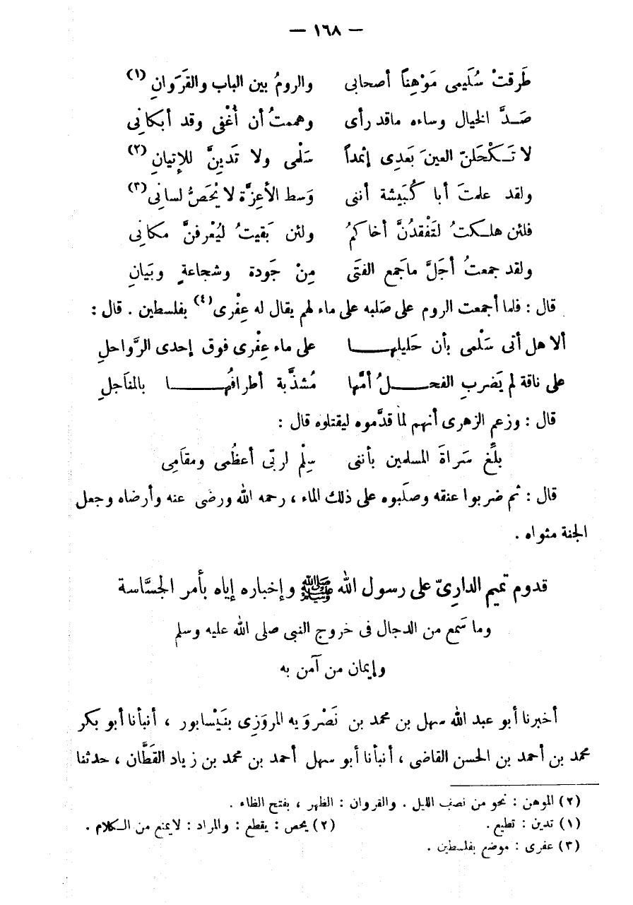 قُدُومُ تَمِيمٍ الدَّارِيِّ عَلَى رَسُولِ اللَّهِ صَلَّى اللَّهُ عَلَيْهِ وَسَلَّمَ وَإِخْبَارُهُ إِيَّاهُ بِأَمْرِ الْجَسَّاسَةِ وَمَا سَمِعَ من الدَّجَّال فِي خُرُوجِ النَّبِيِّ صَلَّى اللَّهُ عَلَيْهِ وَسَلَّمَ وإيمان من آمن بِهِ أَخْبَرَنَا أَبُو عَبْدِ اللَّهِ سَهْلُ بْنُ مُحَمَّدِ بْنِ نَصْرَوَيْهِ الْمَرْوَزِيُّ بِنَيْسَابُورَ، أَنْبَأَنَا أَبُو بَكْرٍ مُحَمَّد بن أَحْمد بن الْحسن القاضى، أَنْبَأَنَا أَبُو سَهْلٍ أَحْمَدُ بْنُ مُحَمَّدِ بْنِ زِيَاد الْقطَّان، حَدثنَا