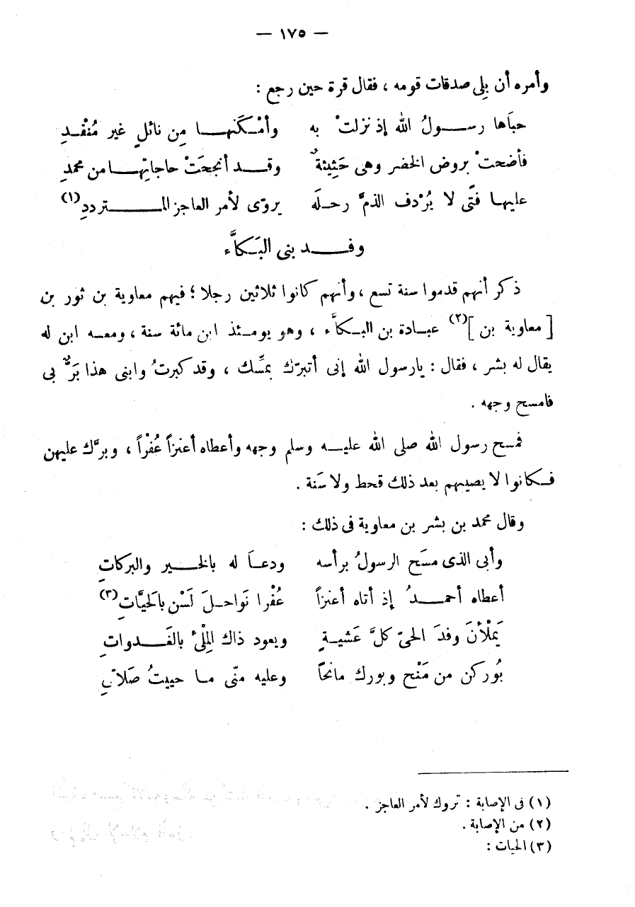 وَقَالَ مُحَمَّدُ بْنُ بِشْرِ بْنِ مُعَاوِيَةَ فِي ذَلِكَ: وَأَبِي الَّذِي مَسَحَ الرَّسُولُ بِرَأْسِهِ * وَدَعَا لَهُ بِالْخَيْرِ وَالْبَرَكَاتِ أَعْطَاهُ أَحْمَدُ إِذْ أَتَاهُ أَعْنُزًا * عفرا نواحل لسن بالحيات (3) يملان وَفد الحى كل عَشِيَّة * وَيعود ذَاك الملئ بِالْغَدَوَاتِ بُورِكْنَ مِنْ مِنَحٍ وَبُورِكَ مَانِحًا * وَعَلَيْهِ منى مَا حييت صَلَاتي