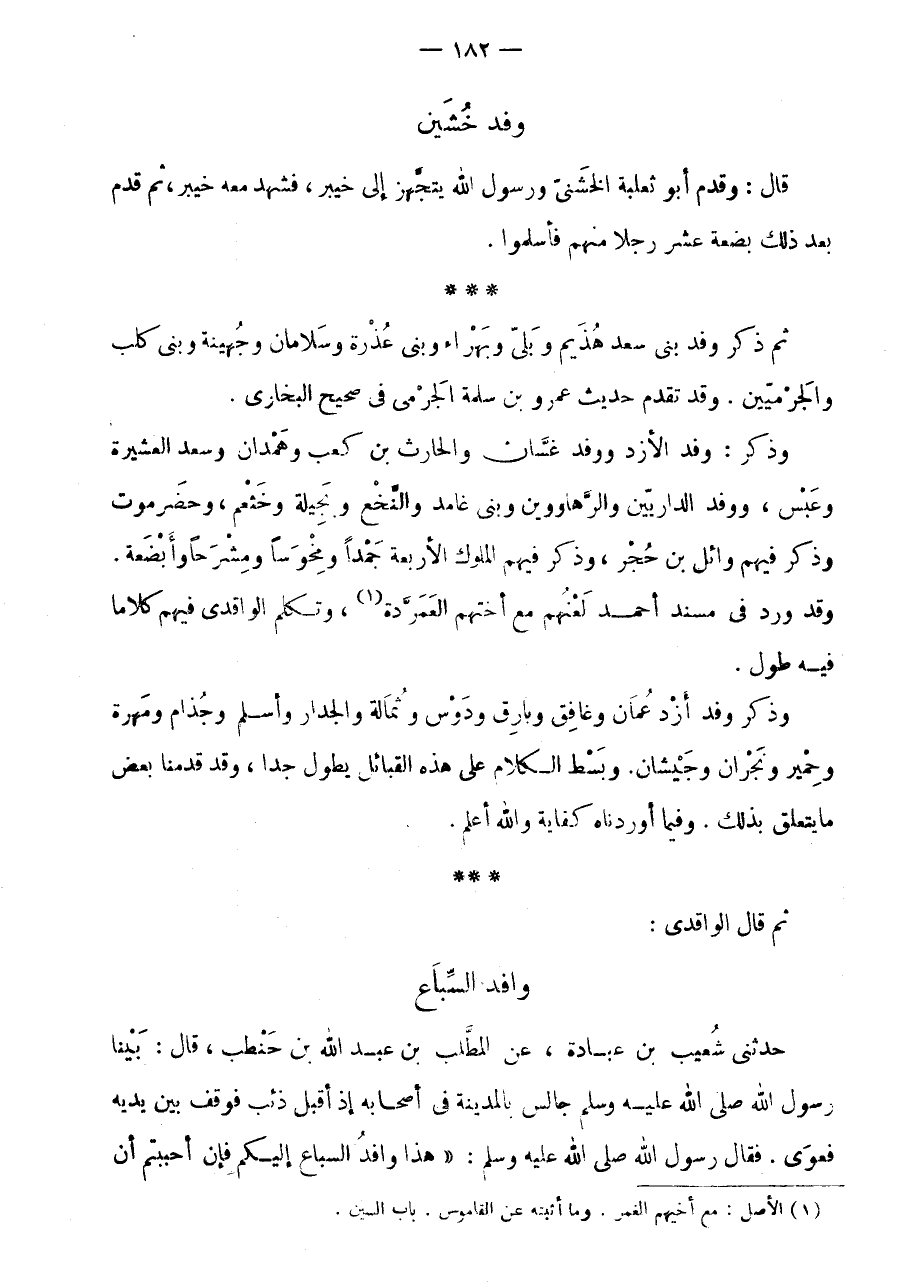 وَذَكَرَ وَفْدَ أَزْدِ عُمَانَ وغافق وبارق ودوس وثمالة والجدار وَأَسْلَمَ وَجُذَامٍ وَمَهْرَةَ وَحِمْيَرَ وَنَجْرَانَ وَجَيْشَانَ.