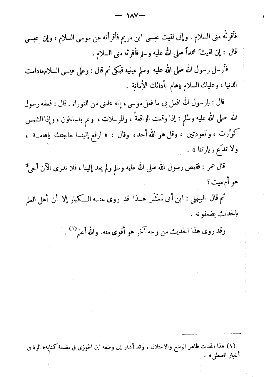 قَالَ عُمَرُ: فَقَبَضَ رَسُولُ اللَّهِ صَلَّى اللَّهُ عَلَيْهِ وَسَلَّمَ وَلِمَ يعد إِلَيْنَا، فَلَا نَدْرِي الْآنَ أَحَيٌّ هُوَ أَمْ ميت؟ ثمَّ قَالَ البيهقى: ابْن أَبى معشر هَذَا قَدْ رَوَى عَنْهُ الْكِبَارُ إِلَّا أَنَّ أَهْلَ الْعِلْمِ بِالْحَدِيثِ يُضَعِّفُونَهُ.