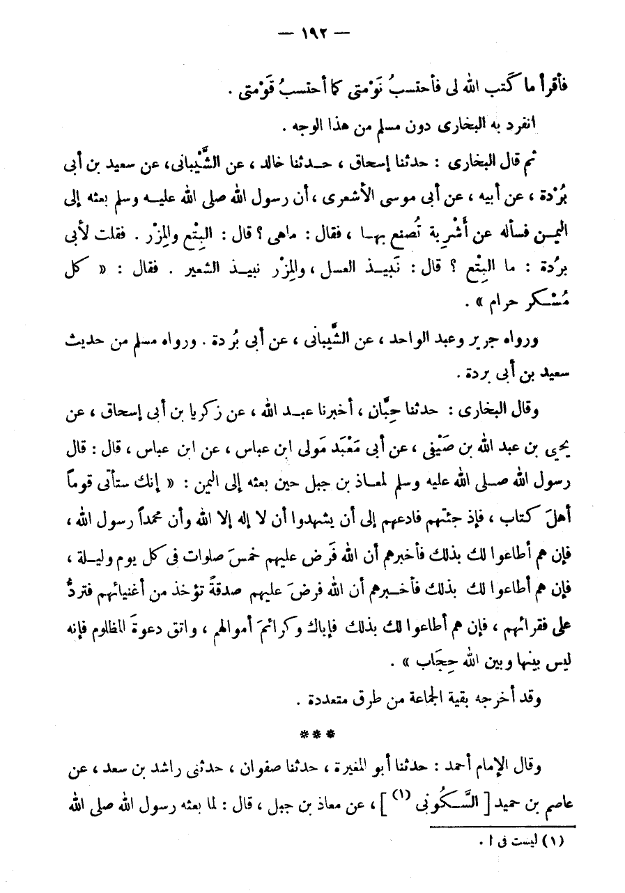 وَقَالَ البُخَارِيّ: حَدثنَا حبَان، أخبرنَا عبد الله، عَن زَكَرِيَّا بن أَبى إِسْحَاقَ، عَنْ يَحْيَى بْنِ عَبْدِ اللَّهِ بْنِ صَيْفِيٍّ، عَنْ أَبِي مَعْبَدٍ مَوْلَى ابْنِ عَبَّاسٍ، عَنِ ابْنِ عَبَّاسٍ، قَالَ: قَالَ رَسُولُ اللَّهِ صَلَّى اللَّهُ عَلَيْهِ وَسَلَّمَ لِمُعَاذِ بْنِ جَبَلٍ حِينَ بَعَثَهُ إِلَى الْيَمَنِ: " إِنَّكَ سَتَأْتِي قَوْمًا أهل كتاب، فَإذْ جِئْتَهُمْ فَادْعُهُمْ إِلَى أَنْ يَشْهَدُوا أَنْ لَا إِلَهَ إِلَّا اللَّهُ وَأَنَّ مُحَمَّدًا رَسُولُ اللَّهِ، فَإِنْ هُمْ أَطَاعُوا لَكَ بِذَلِكَ فَأَخْبِرْهُمْ أَنَّ اللَّهَ فَرَضَ عَلَيْهِمْ خَمْسَ صَلَوَاتٍ فِي كُلِّ يَوْمٍ وَلَيْلَةٍ، فَإِنْ هُمْ أَطَاعُوا لَكَ بِذَلِكَ فَأخْبرهُم أَن الله فَرَضَ عَلَيْهِمْ صَدَقَةً تُؤْخَذُ مِنْ أَغْنِيَائِهِمْ فَتُرَدُّ عَلَى فُقَرَائِهِمْ، فَإِنْ هُمْ أَطَاعُوا لَكَ بِذَلِكَ فَإِيَّاكَ وَكَرَائِمَ أَمْوَالِهِمْ، وَاتَّقِ دَعْوَةَ الْمَظْلُومِ فَإِنَّهُ لَيْسَ بَيْنَهَا وَبَيْنَ اللَّهِ حِجَابٌ ".