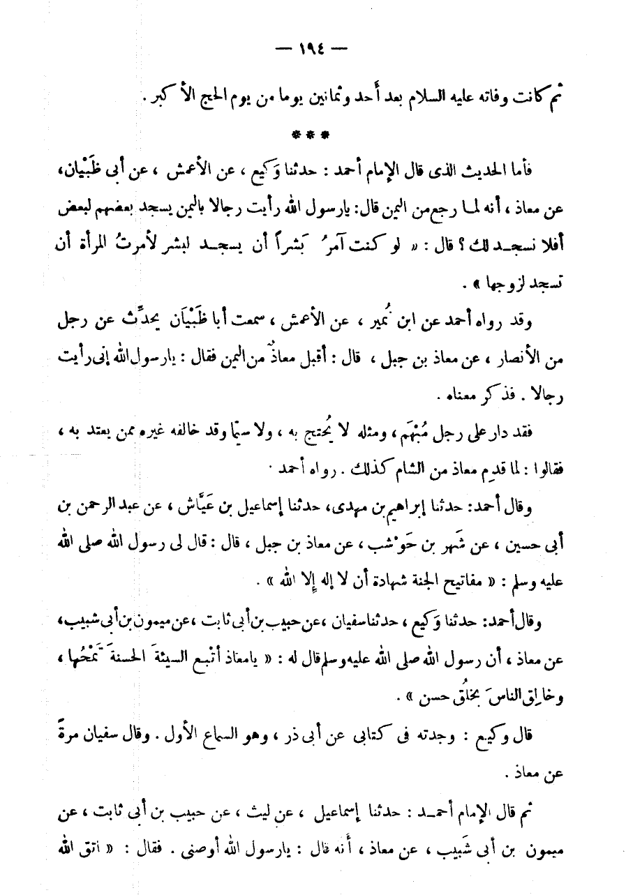 * * * فَأَمَّا الْحَدِيثُ الَّذِي قَالَ الْإِمَامُ أَحْمَدُ: حَدَّثَنَا وَكِيعٌ، عَنِ الْأَعْمَشِ، عَنْ أَبِي ظَبْيَانَ، عَنْ مُعَاذٍ، أَنَّهُ لَمَّا رَجَعَ مِنَ الْيَمَنِ قَالَ: يَا رَسُولَ اللَّهِ رَأَيْتُ رِجَالًا بِالْيَمَنِ يَسْجُدُ بَعْضُهُمْ لِبَعْضٍ أَفَلَا نَسْجُدُ لَكَ؟ قَالَ: " لَو كنت آمُر بَشَرًا أَنْ يَسْجُدَ لِبَشَرٍ لَأَمَرْتُ الْمَرْأَةَ أَنْ تَسْجُدَ لِزَوْجِهَا ".