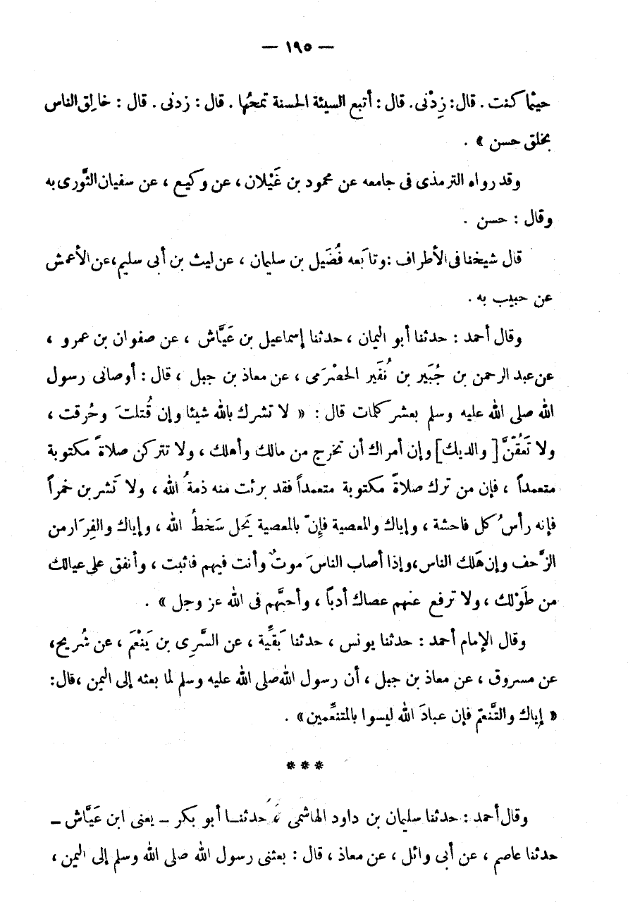 وَقَالَ أَحْمد: حَدثنَا أَبُو الْيَمَان، حَدَّثَنَا إِسْمَاعِيلُ بْنُ عَيَّاشٍ، عَنْ صَفْوَانُ بْنُ عَمْرٍو، عَنْ عَبْدِ الرَّحْمَنِ بْنِ جُبَيْرِ بْنِ نُفَيْرٍ الحصرمي، عَنْ مُعَاذِ بْنِ جَبَلٍ، قَالَ: أَوْصَانِي رَسُولِ اللَّهِ صَلَّى اللَّهُ عَلَيْهِ وَسَلَّمَ بِعَشْرِ كَلِمَاتٍ قَالَ: " لَا تُشْرِكْ بِاللَّهِ شَيْئًا وَإِنْ قُتِلْتَ وَحُرِّقْتَ، وَلَا تَعُقَّنَّ [وَالِدَيْكَ] وَإِنْ أَمَرَاكَ أَنْ تخرج من مَالك وَأهْلك، وَلَا تَتْرُكَنَّ صَلَاةً مَكْتُوبَةً مُتَعَمِّدًا، فَإِنَّ مَنْ تَرَكَ صَلَاةً مَكْتُوبَةً مُتَعَمِّدًا فَقَدْ بَرِئَتْ مِنْهُ ذِمَّةُ اللَّهِ، وَلَا تَشْرَبَنَّ خَمْرًا فَإِنَّهُ رَأَسُ كُلِّ فَاحِشَةٍ، وَإِيَّاكَ وَالْمَعْصِيَةَ فَإِنَّ بِالْمَعْصِيَةِ يَحِلُّ سَخَطُ اللَّهِ، وَإِيَّاكَ وَالْفِرَارَ مِنَ الزَّحْفِ وَإِنْ هَلَكَ النَّاسُ، وَإِذَا أَصَابَ النَّاسَ مَوْتٌ وَأَنْتَ فِيهِمْ فَاثْبُتْ، وَأَنْفِقْ عَلَى عِيَالِكَ مِنْ طَوْلِكَ، وَلَا ترفع عَنْهُم عصاك أدبا، وأحبهم فِي الله عزوجل ".