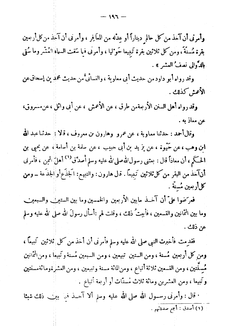 فَقَدِمْتُ فَأَخْبَرْتُ النَّبِيَّ صَلَّى اللَّهُ عَلَيْهِ وَسَلَّمَ فَأَمَرَنِي أَنْ آخُذَ مِنْ كُلِّ ثَلَاثِينَ تَبِيعًا، وَمِنْ كُلِّ أَرْبَعِينَ مُسِنَّةً، وَمِنَ السِّتِّينَ تَبِيعَيْنِ، وَمِنَ السَّبْعِينَ مُسِنَّةً وَتَبِيعًا، وَمِنَ الثَّمَانِينَ مُسِنَّتَيْنِ، وَمِنَ التِّسْعِينَ ثَلَاثَةَ أَتْبَاعٍ، وَمِنَ الْمِائَةِ مُسِنَّةٍ وَتَبِيعَيْنِ، وَمِنَ الْعَشَرَةِ وَمِائَةٍ مُسِنَّتَيْنِ وَتَبِيعًا، وَمِنَ الْعِشْرِينَ وَمِائَةٍ ثَلَاثَ مُسِنَّاتٍ أَوْ أَرْبَعَةَ أَتْبَاعٍ.