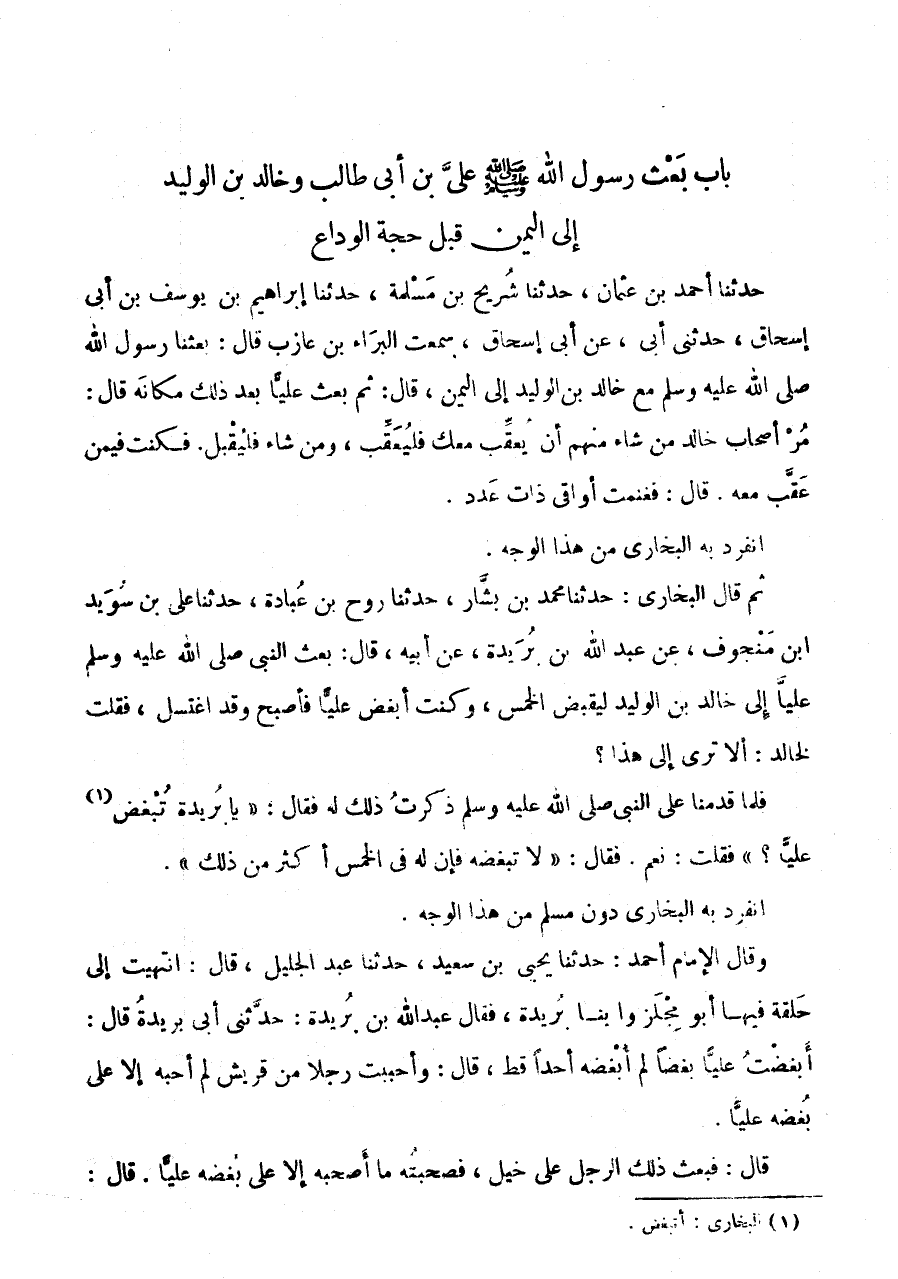 ثُمَّ قَالَ الْبُخَارِيُّ: حَدَّثَنَا مُحَمَّدُ بْنُ بَشَّارٍ، حَدَّثَنَا روح بن عبَادَة، حَدثنَا على بن سُوَيْد ابْن مَنْجُوفٍ، عَنْ عَبْدُ اللَّهِ بْنُ بُرَيْدَةَ، عَنْ أَبِيهِ، قَالَ: بُعِثَ النَّبِيُّ صَلَّى اللَّهُ عَلَيْهِ وَسَلَّمَ عَلِيًّا إِلَى خَالِدِ بْنِ الْوَلِيدِ لِيَقْبِضَ الْخُمُسَ، وَكُنْتُ أُبْغِضُ عَلِيًّا فَأَصْبَحَ وَقَدِ اغْتَسَلَ، فَقُلْتُ لِخَالِدٍ: أَلَا تَرَى إِلَى هَذَا؟ فَلَمَّا قَدِمْنَا عَلَى النَّبِيِّ صَلَّى اللَّهُ عَلَيْهِ وَسَلَّمَ ذَكَرْتُ ذَلِكَ لَهُ فَقَالَ: " يَا بُرَيْدَةُ تُبْغِضُ (1) عَلِيًّا؟ " فَقُلْتُ: نَعَمْ.