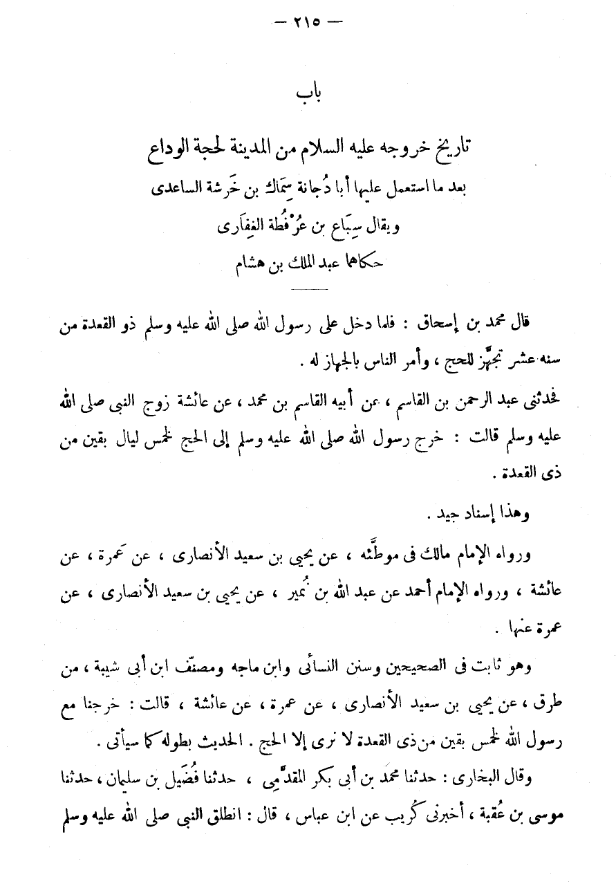 وَهُوَ ثَابت فِي الصَّحِيحَيْنِ وَسنَن النَّسَائِيّ وَابْن مَاجَه ومصنف ابْنِ أَبِي شَيْبَةَ، مِنْ طُرُقٍ، عَنْ يَحْيَى بْنِ سَعِيدٍ الْأَنْصَارِيِّ، عَنْ عَمْرَةَ، عَنْ عَائِشَةَ، قَالَت: خرجنَا مَعَ رَسُول الله لِخَمْسٍ بَقِينَ مِنْ ذِي الْقَعْدَةِ لَا نُرَى إِلَّا الْحَجَّ.