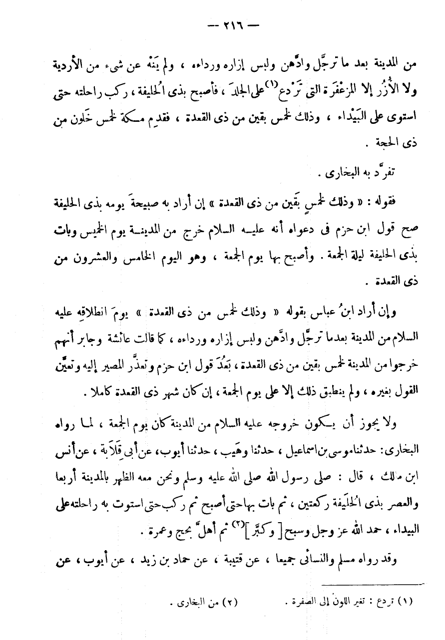 وَلَا يَجُوزُ أَنْ يَكُونَ خُرُوجه عَلَيْهِ السَّلَام مِنَ الْمَدِينَةِ كَانَ يَوْمَ الْجُمُعَةِ، لِمَا رَوَاهُ الْبُخَارِيُّ: حَدَّثَنَا مُوسَى بْنُ إِسْمَاعِيلَ، حَدَّثَنَا وُهَيْبٌ، حَدثنَا أَيُّوب، عَن أَبى قلَابَة، عَن أنس ابْن مَالِكٍ، قَالَ: صَلَّى رَسُولُ اللَّهِ صَلَّى اللَّهُ عَلَيْهِ وَسَلَّمَ وَنَحْنُ مَعَه الظُّهْرَ بِالْمَدِينَةِ أَرْبَعًا وَالْعَصْرَ بِذِي الْحُلَيْفَةِ رَكْعَتَيْنِ، ثُمَّ بَاتَ بِهَا حَتَّى أَصْبَحَ ثُمَّ رَكِبَ حَتَّى اسْتَوَتْ بِهِ رَاحِلَتُهُ عَلَى الْبَيْدَاءِ، حَمِدَ الله عزوجل وَسَبَّحَ [وَكَبَّرَ] (2) ثُمَّ أَهَلَّ بِحَجٍّ وَعُمْرَةٍ.