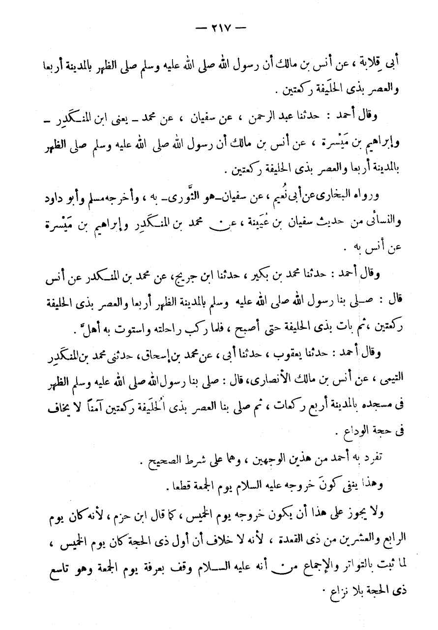 وَقَالَ أَحْمَدُ: حَدَّثَنَا يَعْقُوبُ، حَدَّثَنَا أَبِي، عَنْ مُحَمَّدِ بْنِ إِسْحَاقَ، حَدَّثَنِي مُحَمَّدُ بْنُ الْمُنْكَدِرِ التَّيْمِيُّ، عَنْ أَنَسِ بْنِ مَالِكٍ الْأَنْصَارِيُّ، قَالَ: صَلَّى بِنَا رَسُولُ اللَّهِ صَلَّى اللَّهُ عَلَيْهِ وَسَلَّمَ الظُّهْرَ فِي مَسْجِدِهِ بِالْمَدِينَةِ أَرْبَعَ رَكَعَاتٍ، ثُمَّ صَلَّى بِنَا الْعَصْرَ بِذِي الْحُلَيْفَةِ رَكْعَتَيْنِ آمِنًا لَا يَخَافُ فِي حِجَّةِ الْوَدَاعِ.