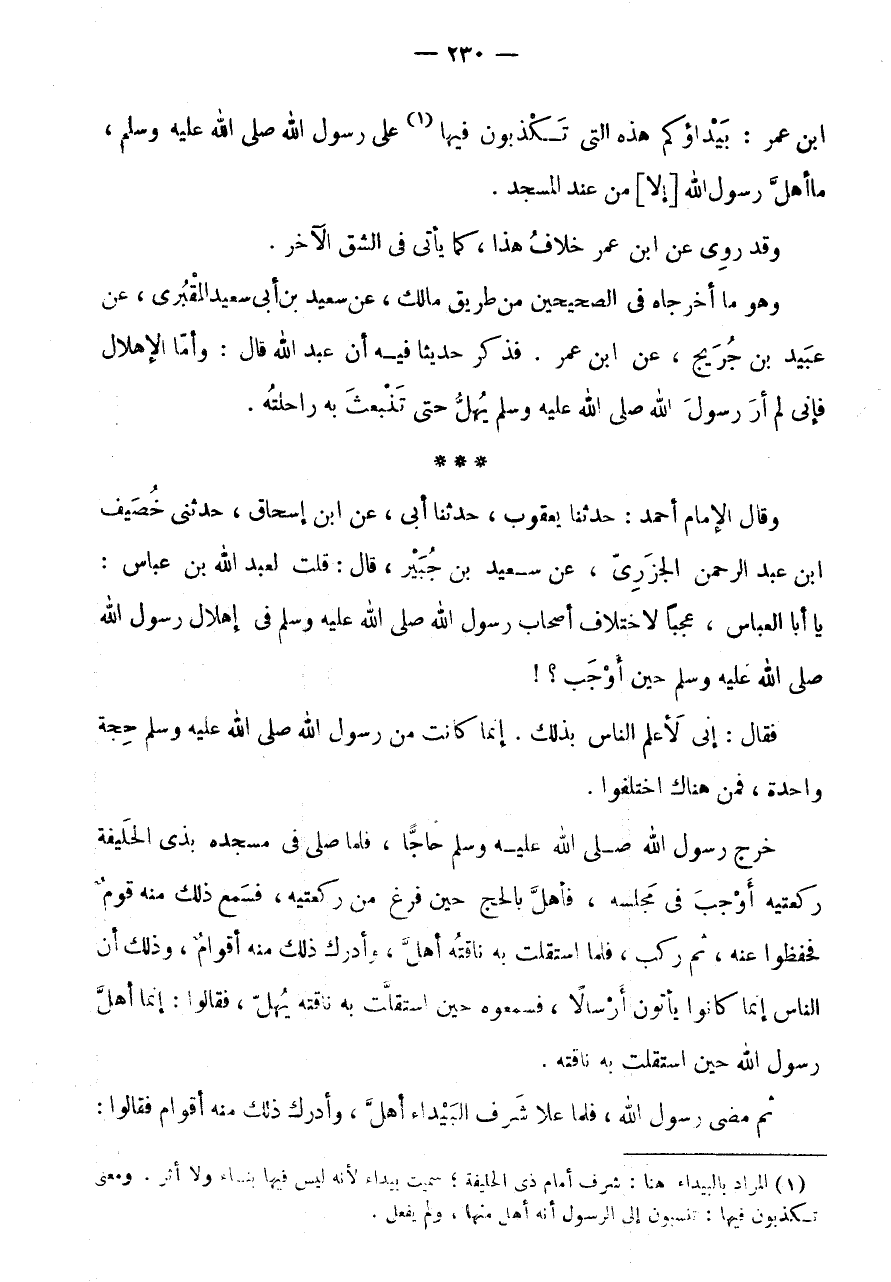 فَذَكَرَ حَدِيثًا فِيهِ أَنَّ عَبْدَ اللَّهِ قَالَ: وَأَمَّا الْإِهْلَالُ فَإِنِّي لَمْ أَرَ رَسُول الله صلى الله عَلَيْهِ وَسلم يهل حَتَّى تَنْبَعِثَ بِهِ رَاحِلَتُهُ.