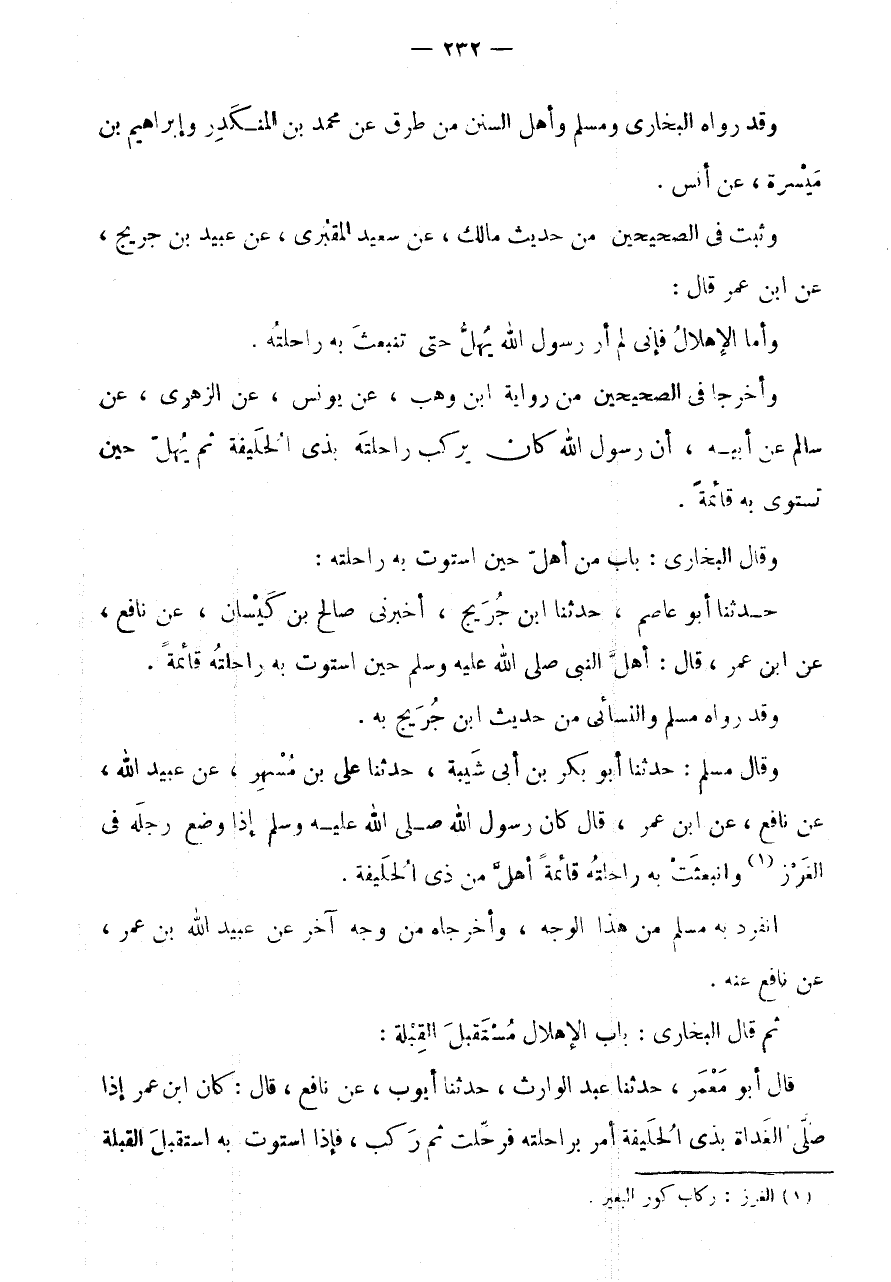 وَثَبَتَ فِي الصَّحِيحَيْنِ مِنْ حَدِيثِ مَالِكٍ، عَنْ سَعِيدٍ الْمَقْبُرِيِّ، عَنْ عُبَيْدِ بْنِ جُرَيْجٍ، عَنِ ابْنِ عُمَرَ قَالَ: وَأَمَّا الْإِهْلَالُ فَإِنِّي لَمْ أَرَ رَسُولَ اللَّهِ يُهِلُّ حَتَّى تَنْبَعِثَ بِهِ رَاحِلَته.
