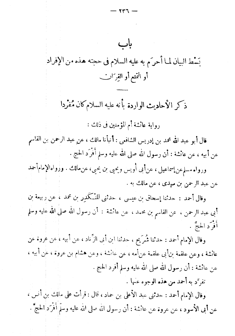 رِوَايَةُ عَائِشَةَ أُمِّ الْمُؤْمِنِينَ فِي ذَلِكَ: قَالَ أَبُو عَبْدِ اللَّهِ مُحَمَّدُ بْنُ إِدْرِيسَ الشَّافِعِيُّ: أَنْبَأَنَا مَالِكٌ، عَنْ عَبْدُ الرَّحْمَنِ بْنُ الْقَاسِمِ عَنْ أَبِيهِ، عَنْ عَائِشَةَ: أَنَّ رَسُولَ اللَّهِ صَلَّى اللَّهُ عَلَيْهِ وَسَلَّمَ أَفْرَدَ الْحَجَّ.