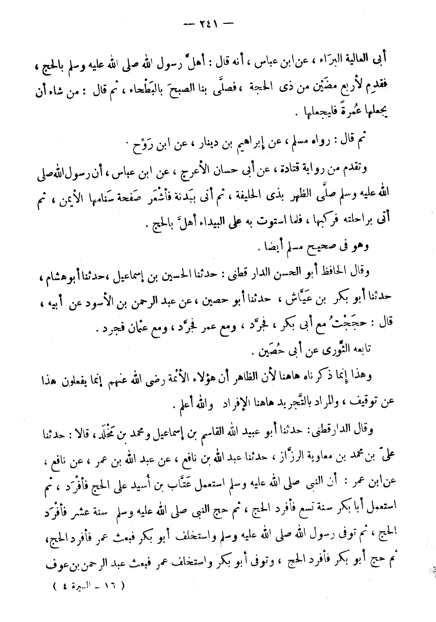 وَقَالَ الدَّارَقُطْنِيّ: حَدثنَا أَبُو عبيد الله الْقَاسِمُ بْنُ إِسْمَاعِيلَ وَمُحَمَّدُ بْنُ مَخْلَدٍ، قَالَا: حَدثنَا على بن مُحَمَّد بن مُعَاوِيَة الرزاز، حَدثنَا عَبْدُ اللَّهِ بْنُ نَافِعٌ، عَنْ عَبْدِ اللَّهِ بْنُ عُمَرَ، عَنْ نَافِعٍ، عَنِ ابْنِ عُمَرَ: أَنَّ النَّبِيَّ صَلَّى اللَّهُ عَلَيْهِ وَسَلَّمَ اسْتَعْمَلَ عَتَّابَ بْنَ أَسِيدٍ عَلَى الْحَجِّ فَأَفْرَدَ، ثُمَّ اسْتَعْمَلَ أَبَا بَكْرٍ سَنَةَ تِسْعٍ فَأَفْرَدَ الْحَجَّ، ثُمَّ حَجَّ النَّبِيُّ صَلَّى اللَّهُ عَلَيْهِ وَسَلَّمَ سَنَةَ عَشْرٍ فَأَفْرَدَ الْحَجَّ، ثُمَّ تُوُفِّيَ رَسُولُ اللَّهِ صَلَّى اللَّهُ عَلَيْهِ وَسَلَّمَ وَاسْتُخْلِفَ أَبُو بَكْرٍ فَبَعَثَ عُمَرَ فَأَفْرَدَ الْحَجَّ، ثُمَّ حَجَّ أَبُو بَكْرٍ فَأَفْرَدَ الْحَجَّ، وَتُوُفِّيَ أَبُو بَكْرٍ وَاسْتُخْلِفَ عُمَرُ فَبَعَثَ عَبْدَ الرَّحْمَنِ بْنَ عَوْفٍ