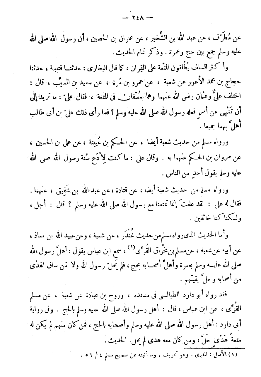 وَأَمَّا الْحَدِيثُ الَّذِي رَوَاهُ مُسْلِمٌ مِنْ حَدِيثِ غُنْدَرٍ، عَنْ شُعْبَةَ، وَعَنْ عُبَيْدِ اللَّهِ بْنِ مُعَاذٍ، عَنْ أَبِيهِ عَنْ شُعْبَةَ، عَنْ مُسْلِمِ بْنِ مِخْرَاقٍ الْقُرِّيِّ (1) ، سَمِعَ ابْنَ عَبَّاسٍ يَقُولُ: أَهَلَّ رَسُولُ اللَّهِ صَلَّى اللَّهُ عَلَيْهِ وَسَلَّمَ بِعُمْرَةٍ وَأَهَلَّ أَصْحَابُهُ بِحَجٍّ، فَلَمْ يَحِلَّ رَسُولُ اللَّهِ وَلَا مَنْ سَاقَ الْهَدْيَ مِنْ أَصْحَابِهِ وَحَلَّ بَقِيَّتُهُمْ.