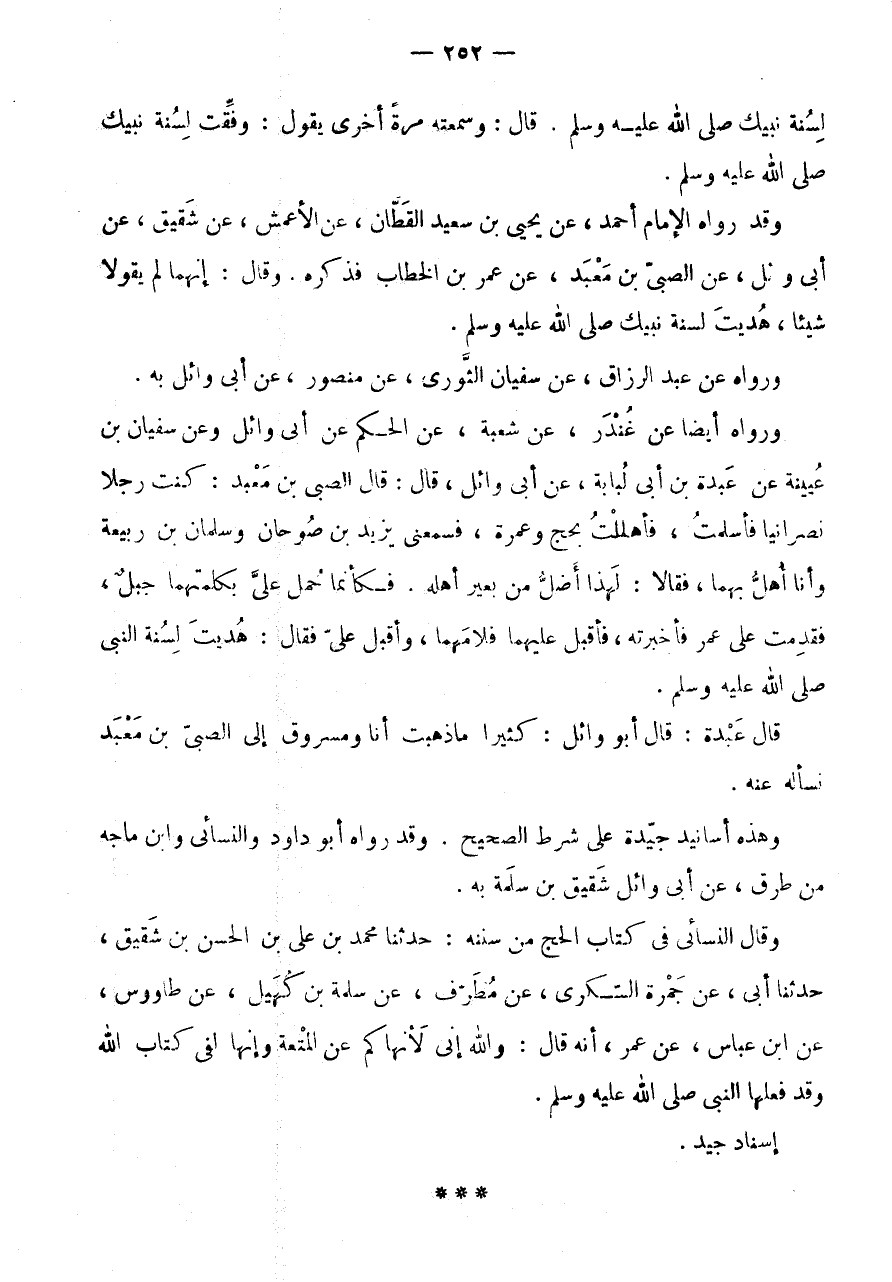 وَقَالَ النَّسَائِيُّ فِي كِتَابِ الْحَجِّ مِنْ سُنَنِهِ: حَدَّثَنَا مُحَمَّدُ بْنُ عَلِيِّ بْنِ الْحَسَنِ بْنِ شَقِيق، حَدثنَا أَبى، عَن جَمْرَة السُّكَّرِيِّ، عَنْ مُطَرِّفٍ، عَنْ سَلَمَةَ بْنِ كُهَيْلٍ، عَن طَاوُوس، عَنِ ابْنِ عَبَّاسٍ، عَنْ عُمَرَ، أَنَّهُ قَالَ: وَاللَّهِ إِنِّي لَأَنْهَاكُمْ عَنِ الْمُتْعَةِ وَإِنَّهَا لَفِي كِتَابِ اللَّهِ وَقَدْ فَعَلَهَا النَّبِيُّ صَلَّى اللَّهُ عَلَيْهِ وَسَلَّمَ.