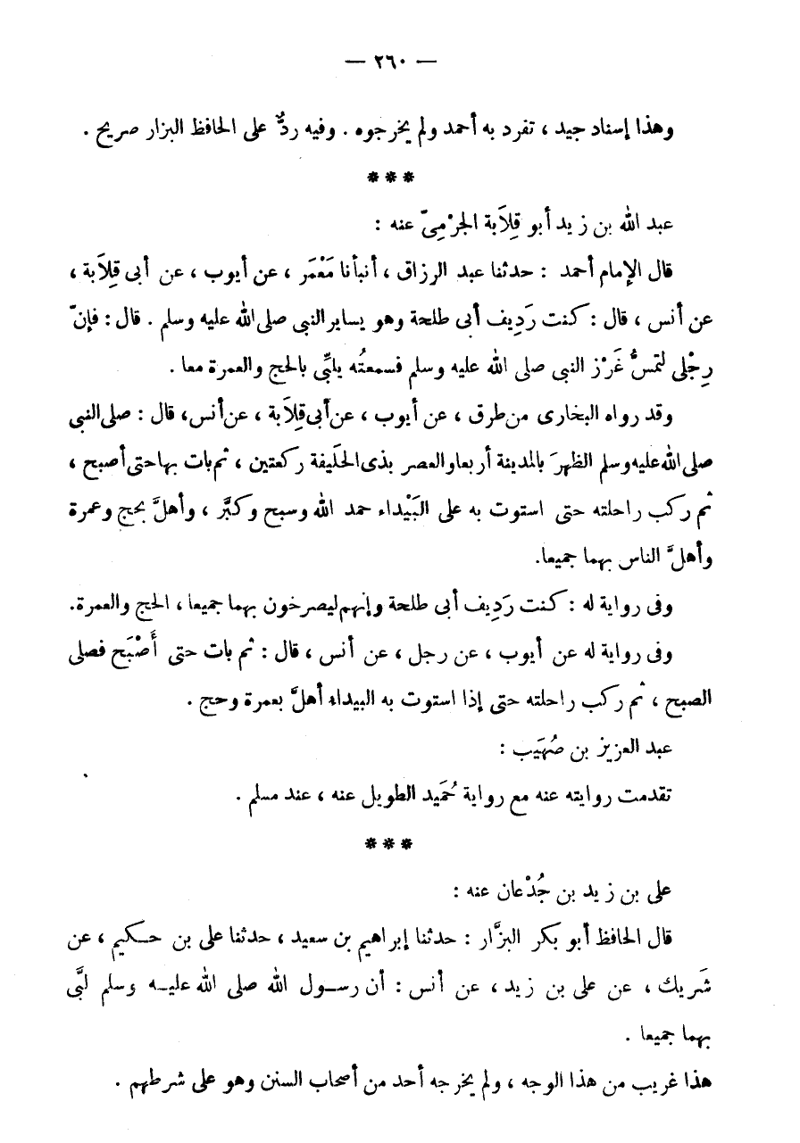 * * * عَبْدُ اللَّهِ بْنُ زَيْدٍ أَبُو قِلَابَةَ الْجَرْمِيُّ عَنْهُ: قَالَ الْإِمَامُ أَحْمَدُ: حَدَّثَنَا عَبْدُ الرَّزَّاقِ، أَنْبَأَنَا مَعْمَرٌ، عَنْ أَيُّوبَ، عَنْ أَبِي قِلَابَةَ، عَنْ أَنَسٍ، قَالَ: كُنْتُ رَدِيفَ أَبِي طَلْحَةَ وَهُوَ يُسَايِرُ النَّبِيَّ صَلَّى اللَّهُ عَلَيْهِ وَسَلَّمَ.