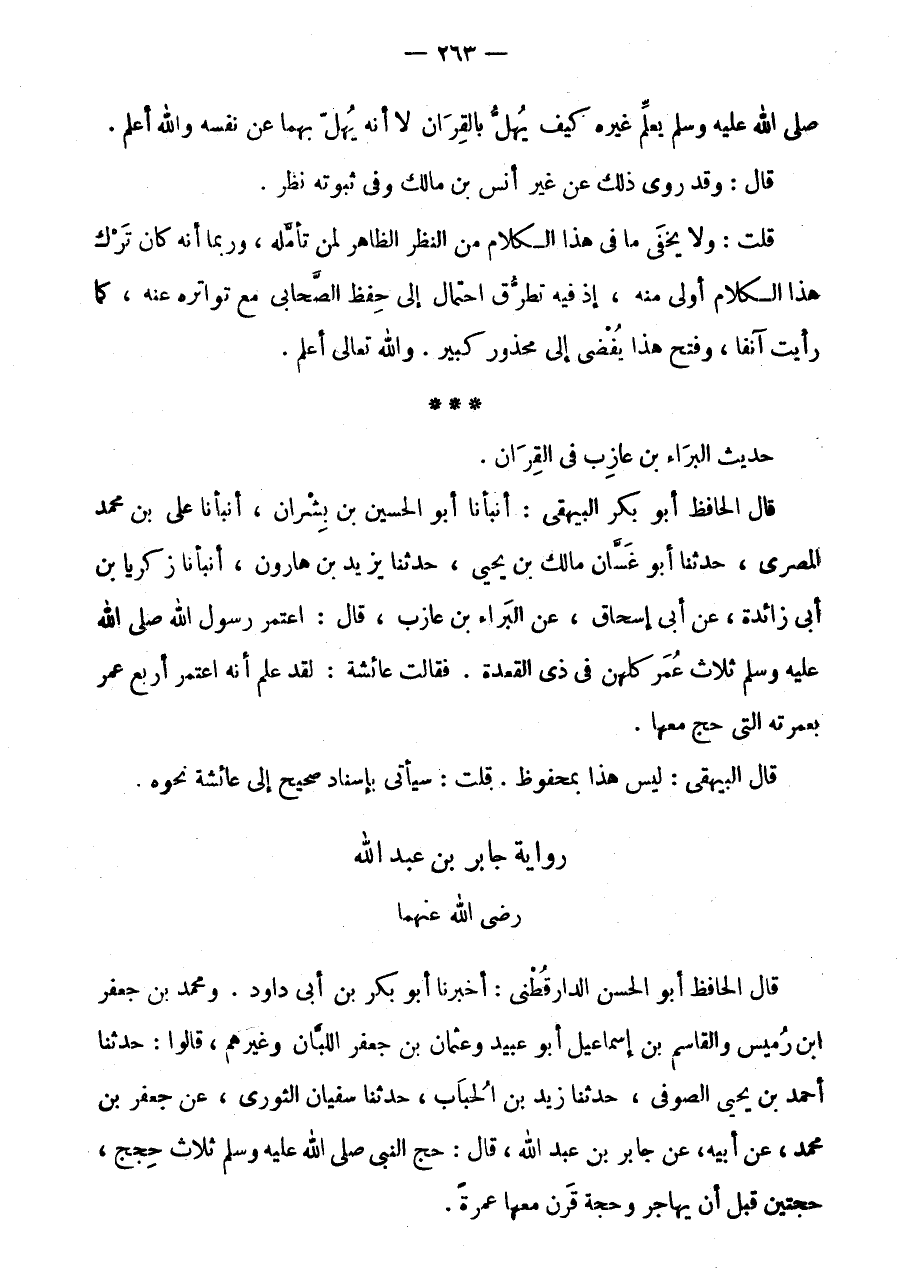 قَالَ الْحَافِظُ أَبُو بَكْرٍ الْبَيْهَقِيُّ: أَنْبَأَنَا أَبُو الْحُسَيْنِ بْنُ بِشْرَانَ، أَنْبَأَنَا عَلِيُّ بْنُ مُحَمَّدٍ الْمِصْرِيُّ، حَدثنَا أَبُو غَسَّان مَالك بن يحيى، حَدثنَا يَزِيدُ بْنُ هَارُونَ، أَنْبَأَنَا زَكَرِيَّا بْنِ أَبِي زَائِدَةَ، عَنْ أَبِي إِسْحَاقَ، عَنِ الْبَرَاءِ بْنِ عَازِبٍ، قَالَ: اعْتَمَرَ رَسُولُ اللَّهِ صَلَّى اللَّهُ عَلَيْهِ وَسَلَّمَ ثَلَاثَ عُمَرٍ كُلُّهُنَّ فِي ذِي الْقَعْدَةِ.