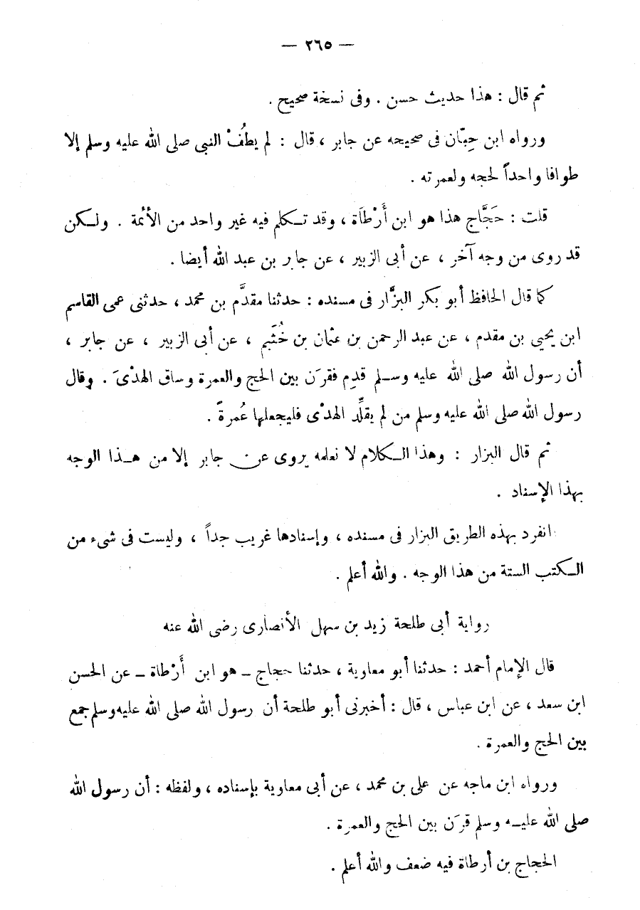 رِوَايَةُ أَبِي طَلْحَةَ زَيْدِ بْنِ سَهْلٍ الْأَنْصَارِيِّ رَضِيَ اللَّهُ عَنْهُ قَالَ الْإِمَامُ أَحْمَدُ: حَدَّثَنَا أَبُو مُعَاوِيَة، حَدثنَا حجاج - هُوَ ابْن أَرْطَاة - عَن الْحسن ابْن سَعْدٍ، عَنِ ابْنِ عَبَّاسٍ، قَالَ: أَخْبَرَنِي أَبُو طَلْحَةَ أَنَّ رَسُولَ اللَّهِ صَلَّى اللَّهُ عَلَيْهِ وَسَلَّمَ جَمَعَ بَيْنَ الْحَجِّ وَالْعُمْرَةِ.