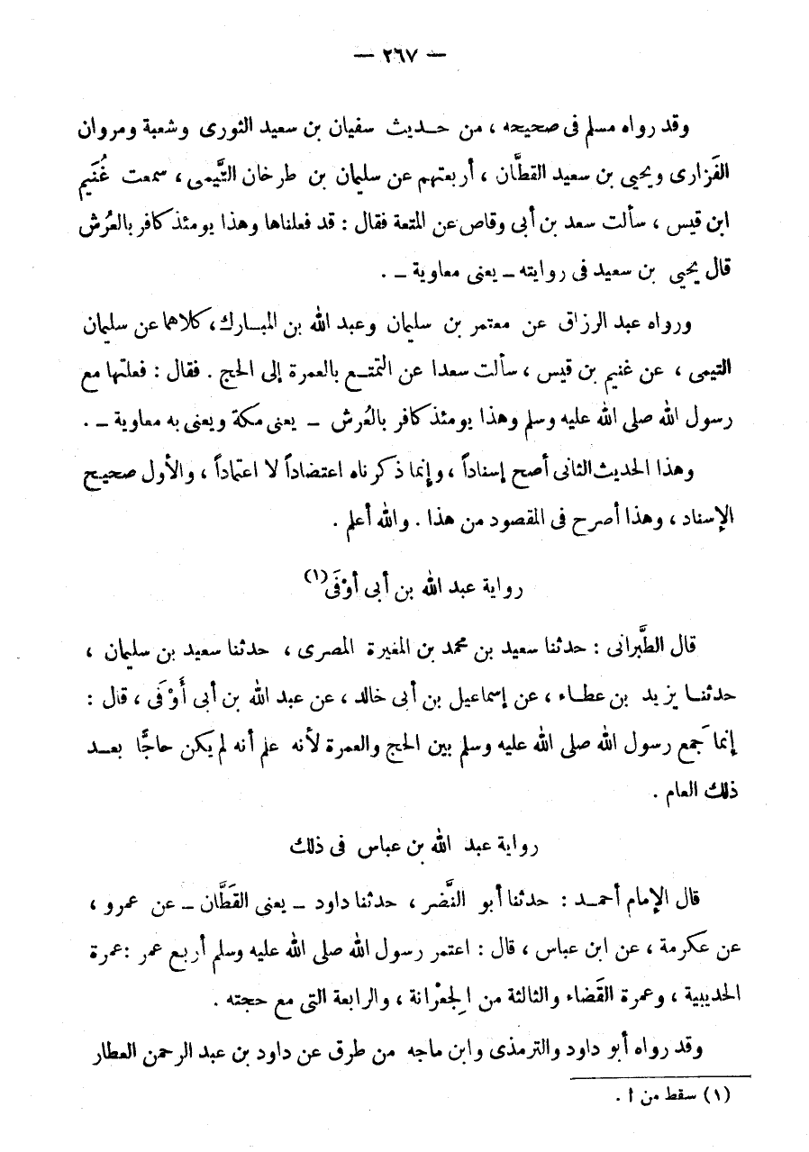 رِوَايَةُ عَبْدِ اللَّهِ بْنِ أَبِي أَوْفَى (1) قَالَ الطَّبَرَانِيُّ: حَدَّثَنَا سَعِيدُ بْنُ مُحَمَّدِ بْنِ الْمُغِيرَةِ الْمِصْرِيُّ، حَدَّثَنَا سَعِيدُ بْنُ سُلَيْمَانَ، حَدَّثَنَا يَزِيدُ بْنُ عَطَاءٍ، عَنْ إِسْمَاعِيلَ بْنِ أَبِي خَالِدٍ، عَنْ عَبْدِ اللَّهِ بْنِ أَبِي أَوْفَى، قَالَ: إِنَّمَا جَمَعَ رَسُولُ اللَّهِ صَلَّى اللَّهُ عَلَيْهِ وَسَلَّمَ بَيْنَ الْحَجِّ وَالْعُمْرَةِ لِأَنَّهُ عَلِمَ أَنَّهُ لَمْ يَكُنْ حَاجًّا بَعْدَ ذَلِكَ الْعَامِ.