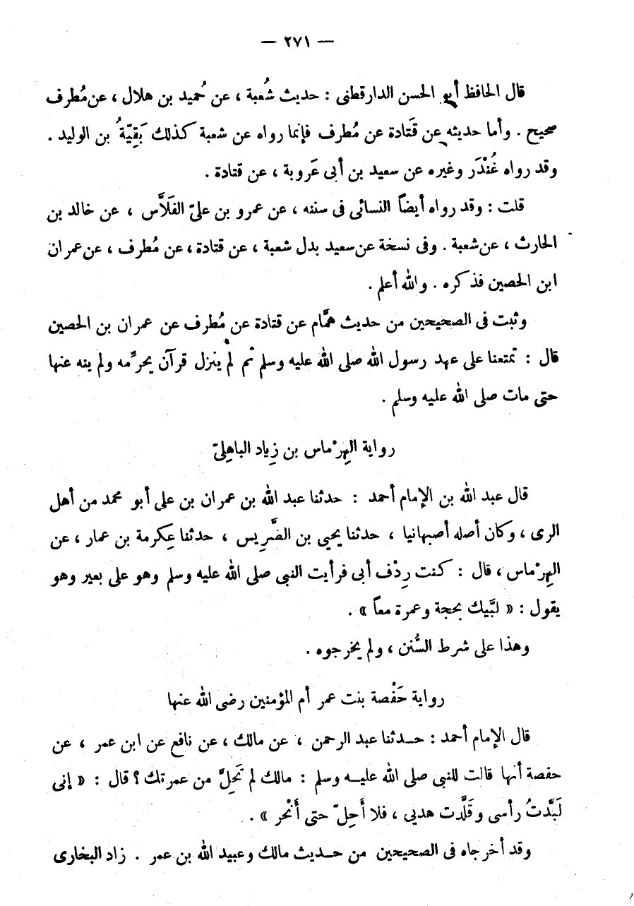 وَثَبَتَ فِي الصَّحِيحَيْنِ مِنْ حَدِيثِ هَمَّامٍ عَنْ قَتَادَةَ عَنْ مُطَرِّفٍ عَنْ عِمْرَانَ بْنِ الْحُصَيْنِ قَالَ: تَمَتَّعْنَا عَلَى عَهْدِ رَسُولُ اللَّهِ صَلَّى اللَّهُ عَلَيْهِ وَسَلَّمَ ثُمَّ لم ينزل قُرْآن يحرمه وَلم ينْه عَنْهَا حَتَّى مَاتَ صَلَّى اللَّهُ عَلَيْهِ وَسَلَّمَ.