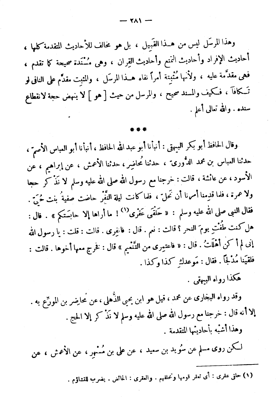 * * * وَقَالَ الْحَافِظُ أَبُو بَكْرٍ الْبَيْهَقِيُّ: أَنْبَأَنَا أَبُو عَبْدِ اللَّهِ الْحَافِظُ، أَنْبَأَنَا أَبُو الْعَبَّاسِ الْأَصَمُّ، حَدَّثَنَا الْعَبَّاسُ بْنُ مُحَمَّدٍ الدُّورِيُّ، حَدَّثَنَا مُحَاضِرٌ، حَدَّثَنَا الْأَعْمَشُ، عَنْ إِبْرَاهِيمَ، عَنِ الْأَسْوَدِ، عَنْ عَائِشَةَ، قَالَتْ: خَرَجْنَا مَعَ رَسُولِ اللَّهِ صَلَّى اللَّهُ عَلَيْهِ وَسَلَّمَ لَا نَذْكُرُ حَجًّا وَلَا عُمْرَةً، فَلَمَّا قَدِمْنَا أَمَرَنَا أَنْ نَحِلَّ، فَلَمَّا كَانَتْ لَيْلَةُ النَّفْرِ حَاضَتْ صَفِيَّةُ بِنْتُ حُيَيٍّ.