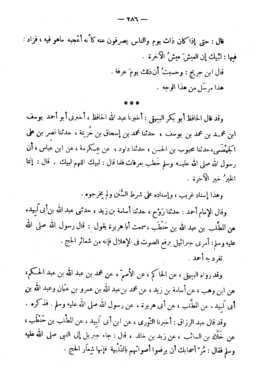 وَقَالَ الامام أَحْمد: حَدثنَا روح، حَدثنَا أُسَامَةُ بْنُ زَيْدٍ، حَدَّثَنِي عَبْدُ اللَّهِ بْنُ أَبِي لَبِيدٍ، عَنِ الْمُطَّلِبِ بْنِ عَبْدِ اللَّهِ بْنِ حَنْطَبٍ، سَمِعْتُ أَبَا هُرَيْرَةَ يَقُولُ: قَالَ رَسُولُ اللَّهِ صَلَّى اللَّهُ عَلَيْهِ وَسَلَّمَ: أَمَرَنِي جِبْرَائِيل بِرَفْعِ الصَّوْتِ فِي الْإِهْلَالِ فَإِنَّهُ مِنْ شَعَائِرِ الْحَجِّ.