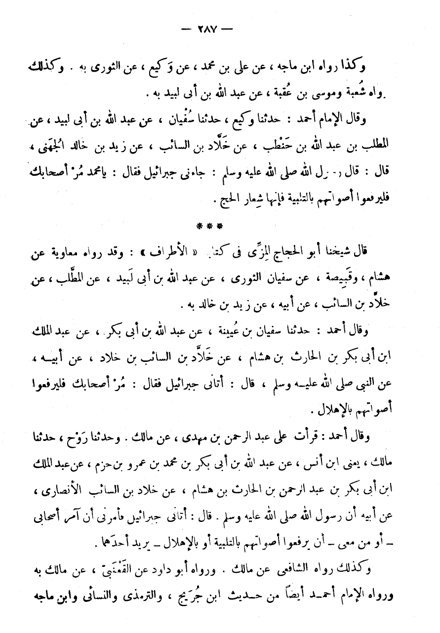 وَقَالَ أَحْمَدُ: حَدَّثَنَا سُفْيَانُ بْنُ عُيَيْنَةَ، عَنْ عَبْدِ اللَّهِ بْنِ أَبِي بَكْرٍ، عَنْ عَبْدِ الْمَلِكِ ابْن أَبِي بَكْرِ بْنِ الْحَارِثِ بْنِ هِشَامٍ، عَنْ خَلَّادِ بْنِ السَّائِبِ بْنِ خَلَّادٍ، عَنْ أَبِيهِ، عَنِ النَّبِيِّ صَلَّى اللَّهُ عَلَيْهِ وَسَلَّمَ، قَالَ: أتانى جِبْرَائِيل فَقَالَ: مُرْ أَصْحَابَكَ فَلْيَرْفَعُوا أَصْوَاتَهُمْ بِالْإِهْلَالِ.