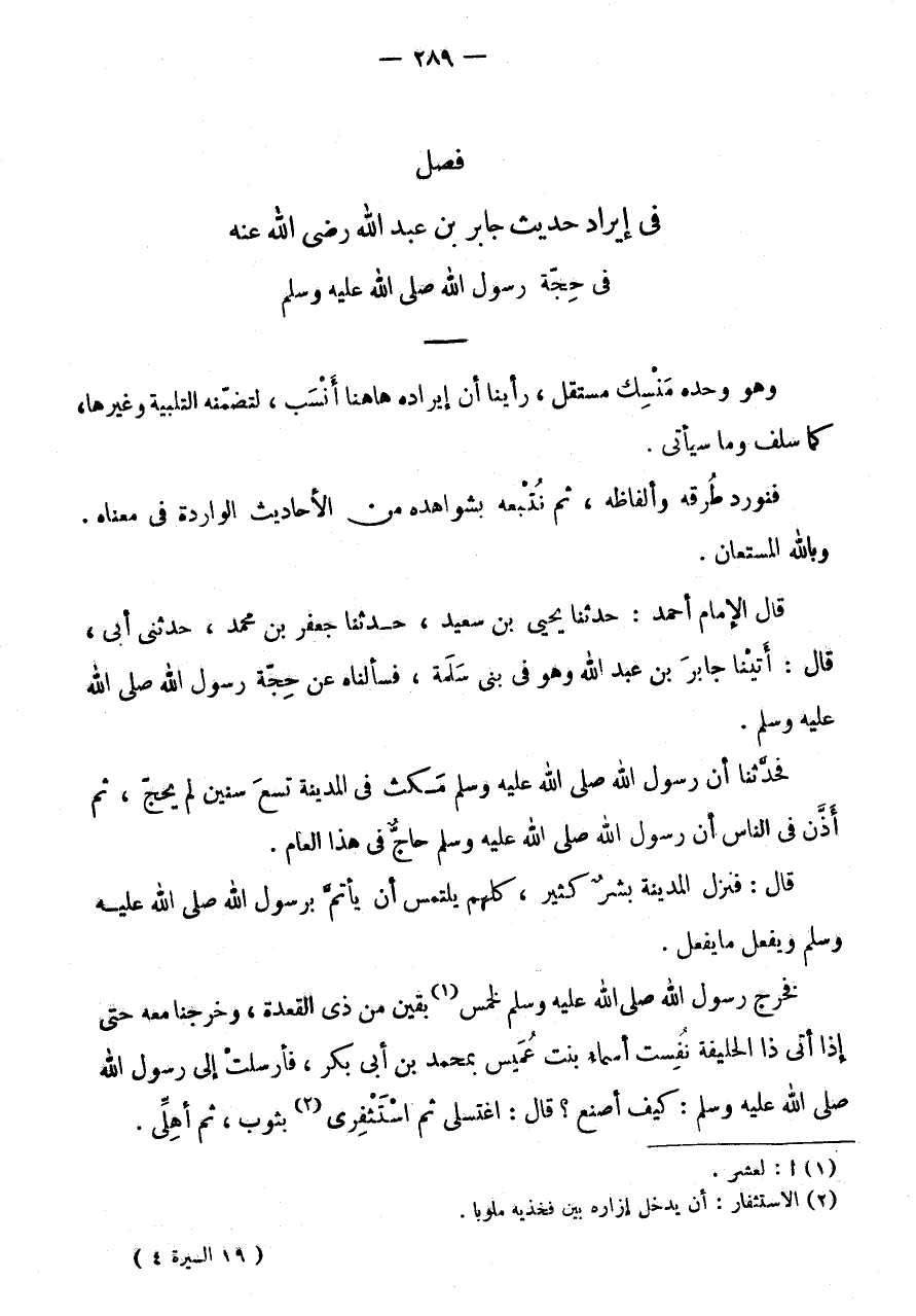 فَصْلٌ فِي إِيرَادِ حَدِيثِ جَابِرِ بْنِ عَبْدِ اللَّهِ رَضِيَ اللَّهُ عَنْهُ فِي حَجَّةِ رَسُولِ اللَّهِ صَلَّى اللَّهُ عَلَيْهِ وَسَلَّمَ وَهُوَ وَحْدَهُ مَنْسَكٌ مُسْتَقِلٌّ، رَأَيْنَا أَنَّ إِيرَادَهُ هَاهُنَا أَنْسَبُ، لتَضَمّنه التَّلْبِيَة وَغَيرهَا، كَمَا سَلَفَ وَمَا سَيَأْتِي.