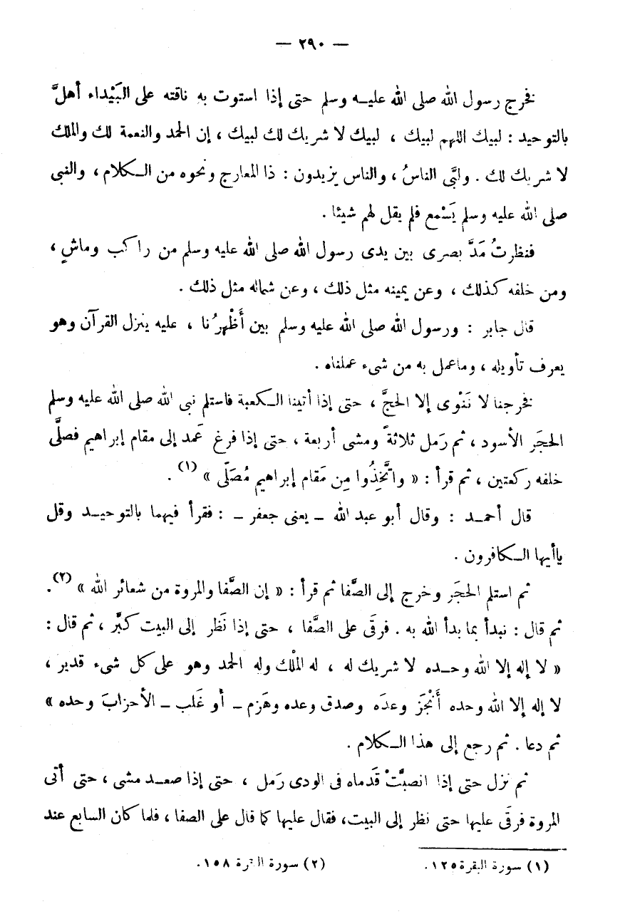 فَخَرَجَ رَسُولِ اللَّهِ صَلَّى اللَّهُ عَلَيْهِ وَسَلَّمَ حَتَّى إِذَا اسْتَوَتْ بِهِ نَاقَتُهُ عَلَى الْبَيْدَاءِ أَهَلَّ بِالتَّوْحِيدِ: لَبَّيْكَ اللَّهُمَّ لَبَّيْكَ، لَبَّيْكَ لَا شَرِيكَ لَكَ لَبَّيْكَ، إِنَّ الْحَمْدَ وَالنِّعْمَةَ لَكَ وَالْمُلْكَ لَا شَرِيكَ لَكَ.