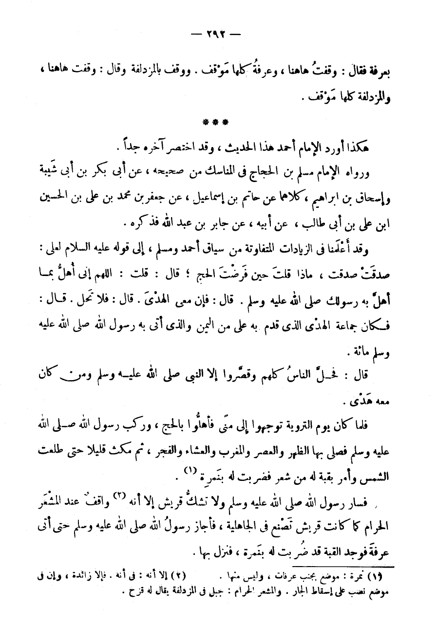 فَسَارَ رَسُولِ اللَّهِ صَلَّى اللَّهُ عَلَيْهِ وَسَلَّمَ وَلَا تَشُكُّ قُرَيْشٌ إِلَّا أَنَّهُ (2) وَاقِفٌ عِنْدَ الْمَشْعَرِ الْحَرَامِ كَمَا كَانَتْ قُرَيْشٌ تَصْنَعُ فِي الْجَاهِلِيَّةِ، فَأَجَازَ رَسُولِ اللَّهِ صَلَّى اللَّهُ عَلَيْهِ وَسَلَّمَ حَتَّى أَتَى عَرَفَةَ فَوَجَدَ الْقُبَّةَ قَدْ ضُرِبَتْ لَهُ بِنَمِرَةَ، فَنزل بهَا.