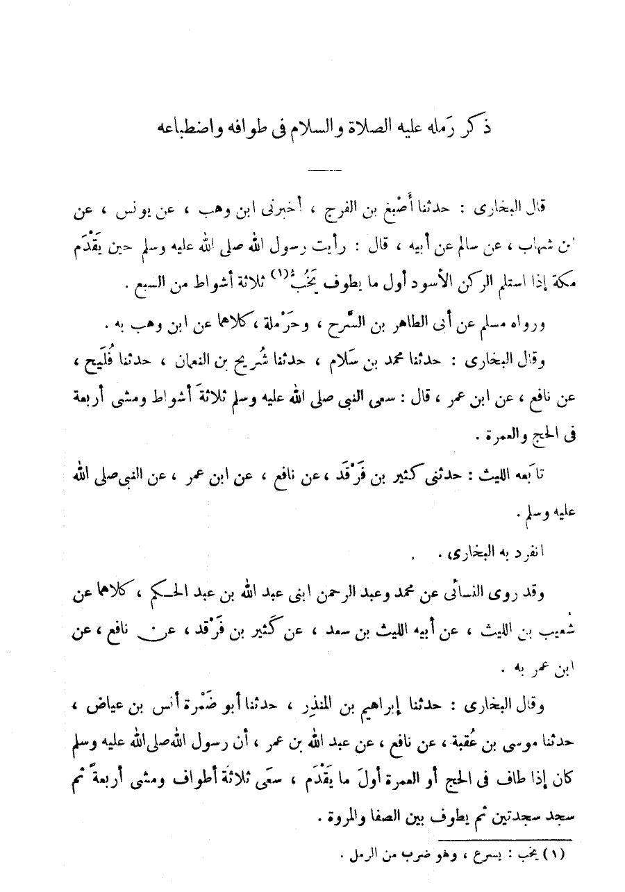 وَقَالَ البُخَارِيّ: حَدثنَا مُحَمَّد بن سَلام، حَدثنَا شُرَيْح بن النُّعْمَان، حَدثنَا فُلَيْحٌ، عَنْ نَافِعٍ، عَنِ ابْنِ عُمَرَ، قَالَ: سَعَى النَّبِيُّ صَلَّى اللَّهُ عَلَيْهِ وَسَلَّمَ ثَلَاثَةَ أَشْوَاطٍ وَمَشَى أَرْبَعَةً فِي الْحَجِّ وَالْعُمْرَةِ.
