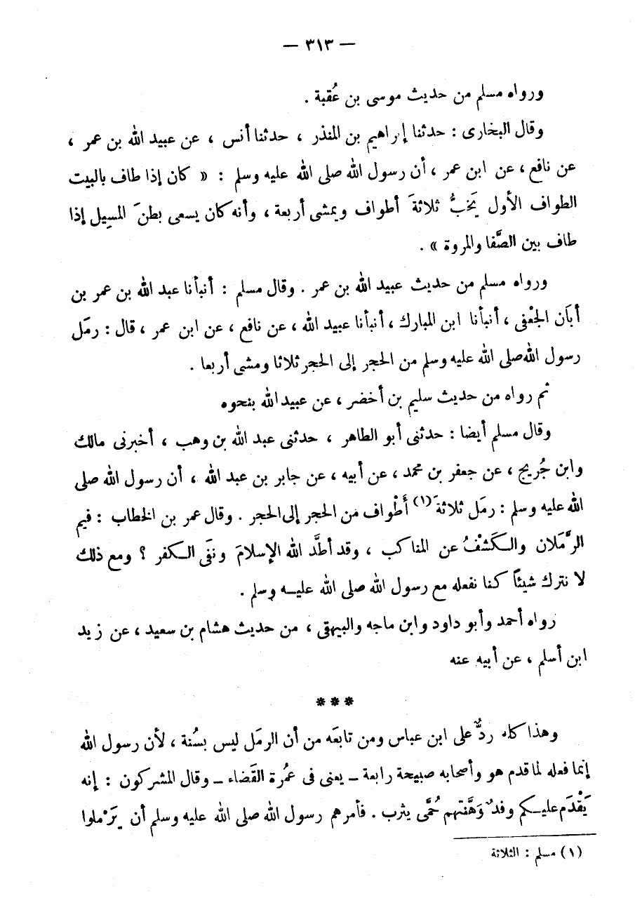 ثُمَّ رَوَاهُ مِنْ حَدِيثِ سُلَيْمِ بْنِ أَخْضَرَ، عَنْ عُبَيْدِ اللَّهِ بِنَحْوِهِ وَقَالَ مُسْلِمٌ أَيْضًا: حَدَّثَنِي أَبُو الطَّاهِرِ، حَدَّثَنِي عَبْدُ اللَّهِ بْنُ وَهْبٍ، أَخْبَرَنِي مَالِكٌ وَابْنُ جُرَيْجٍ، عَنْ جَعْفَرِ بْنِ مُحَمَّدٍ، عَنْ أَبِيهِ، عَنْ جَابِرِ بْنِ عَبْدِ اللَّهِ، أَنَّ رَسُولَ اللَّهِ صَلَّى اللَّهُ عَلَيْهِ وَسَلَّمَ: رمل ثَلَاثَة (1) أَطْوَافٍ مِنَ الْحَجَرِ إِلَى الْحَجَرِ.