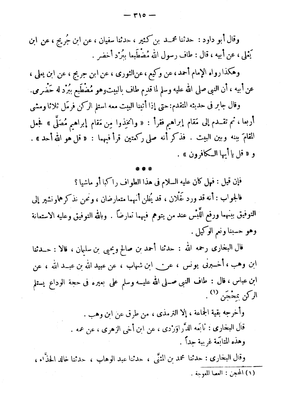 * * * فَإِن قيل: فَهَل كَانَ عَلَيْهِ السَّلَام فِي هَذَا الطَّوَافِ رَاكِبًا أَوْ مَاشِيًا؟ فَالْجَوَابُ: أَنَّهُ قَدْ وَرَدَ نَقْلَانِ، قَدْ يُظَنُّ أَنَّهُمَا مُتَعَارِضَانِ، وَنَحْنُ نَذْكُرُهُمَا وَنُشِيرُ إِلَى التَّوْفِيقِ بَيْنَهُمَا وَرَفْعِ اللَّبْسِ عِنْدَ مَنْ يَتَوَهَّمُ فِيهِمَا تَعَارُضًا.