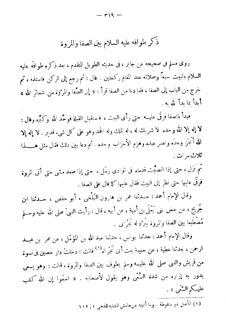 وَقَالَ الامام أَحْمد: حَدثنَا يُونُس، حَدثنَا عَبْدُ اللَّهِ بْنُ الْمُؤَمَّلِ، عَنْ عُمَرَ بْنِ عبد الرَّحْمَن، حَدثنَا عَطِيَّة، عَن حَبِيبَة بنت أَبى نجراة (1) قَالَت: دخلت دَار حُصَيْن فِي نِسْوَةٍ مِنْ قُرَيْشٍ وَالنَّبِيُّ صَلَّى اللَّهُ عَلَيْهِ وَسَلَّمَ يَطُوفُ بَيْنَ الصَّفَا وَالْمَرْوَةِ، قَالَتْ: وَهُوَ يَسْعَى يَدُورُ بِهِ إِزَارُهُ مِنْ شِدَّةِ السَّعْيِ وَهُوَ يَقُولُ لِأَصْحَابِهِ.