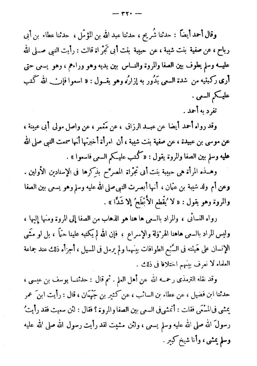 ثمَّ قَالَ: حَدَّثَنَا يُوسُفُ بْنُ عِيسَى، حَدَّثَنَا ابْنُ فُضَيْلٍ، عَنْ عَطَاءِ بْنِ السَّائِبِ، عَنْ كثير بن جهمان، قَالَ: رَأَيْتُ ابْنَ عُمَرَ يَمْشِي فِي الْمَسْعَى فَقُلْتُ: أَتَمْشِي فِي السَّعْيِ بَيْنَ الصَّفَا وَالْمَرْوَةِ؟ فَقَالَ: لَئِن سعيت فَقَدْ رَأَيْتُ رَسُولَ اللَّهِ صَلَّى اللَّهُ عَلَيْهِ وَسَلَّمَ يَسْعَى، وَلَئِنْ مَشَيْتُ لَقَدْ رَأَيْتُ رَسُولَ اللَّهِ صَلَّى اللَّهُ عَلَيْهِ وَسَلَّمَ يَمْشِي، وَأَنَا شيخ كَبِير.