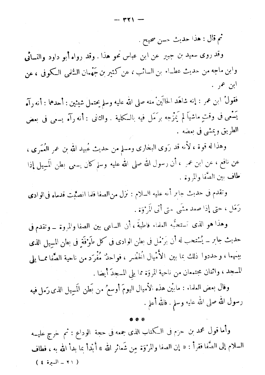 * * * وَأَمَّا قَوْلُ مُحَمَّدِ بْنِ حَزْمٍ فِي الْكِتَابِ الَّذِي جَمَعَهُ فِي حجَّة الْوَدَاع: ثمَّ خرج عَلَيْهِ السَّلَام إِلَى الصَّفَا فَقَرَأَ: " إِنَّ الصَّفَا وَالْمَرْوَةَ مِنْ شَعَائِر الله " أَبْدَأُ بِمَا بَدَأَ اللَّهُ بِهِ، فَطَافَ