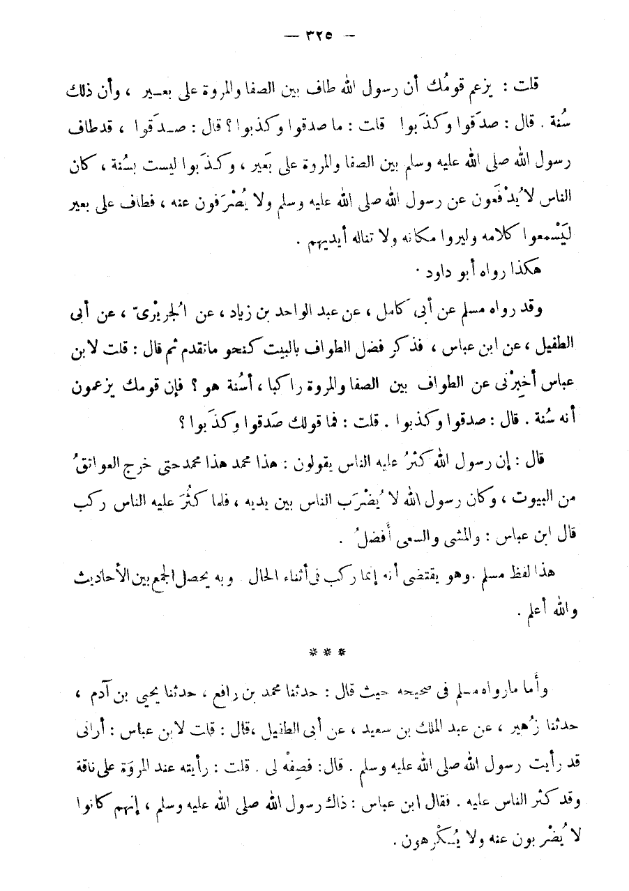 قلت: يزْعم قَوْمك أَن رَسُول الله طَافَ بَيْنَ الصَّفَا وَالْمَرْوَةِ عَلَى بَعِيرٍ، وَأَنَّ ذَلِكَ سُنَّةٌ.