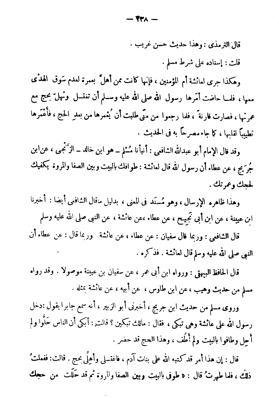 وَرَوَى مُسْلِمٌ مِنْ حَدِيثِ ابْنُ جُرَيْجٍ، أَخْبَرَنِي أَبُو الزُّبَيْرِ، أَنَّهُ سَمِعَ جَابِرًا يَقُولُ: دخل رَسُول الله عَلَى عَائِشَةَ وَهِيَ تَبْكِي، فَقَالَ: مَالَكِ تَبْكِينَ؟ قَالَتْ: أَبْكِي أَنَّ النَّاسَ حَلُّوا وَلَمْ أَحِلَّ وَطَافُوا بِالْبَيْتِ وَلَمْ أَطُفْ، وَهَذَا الْحَجُّ قَدْ حَضَرَ.