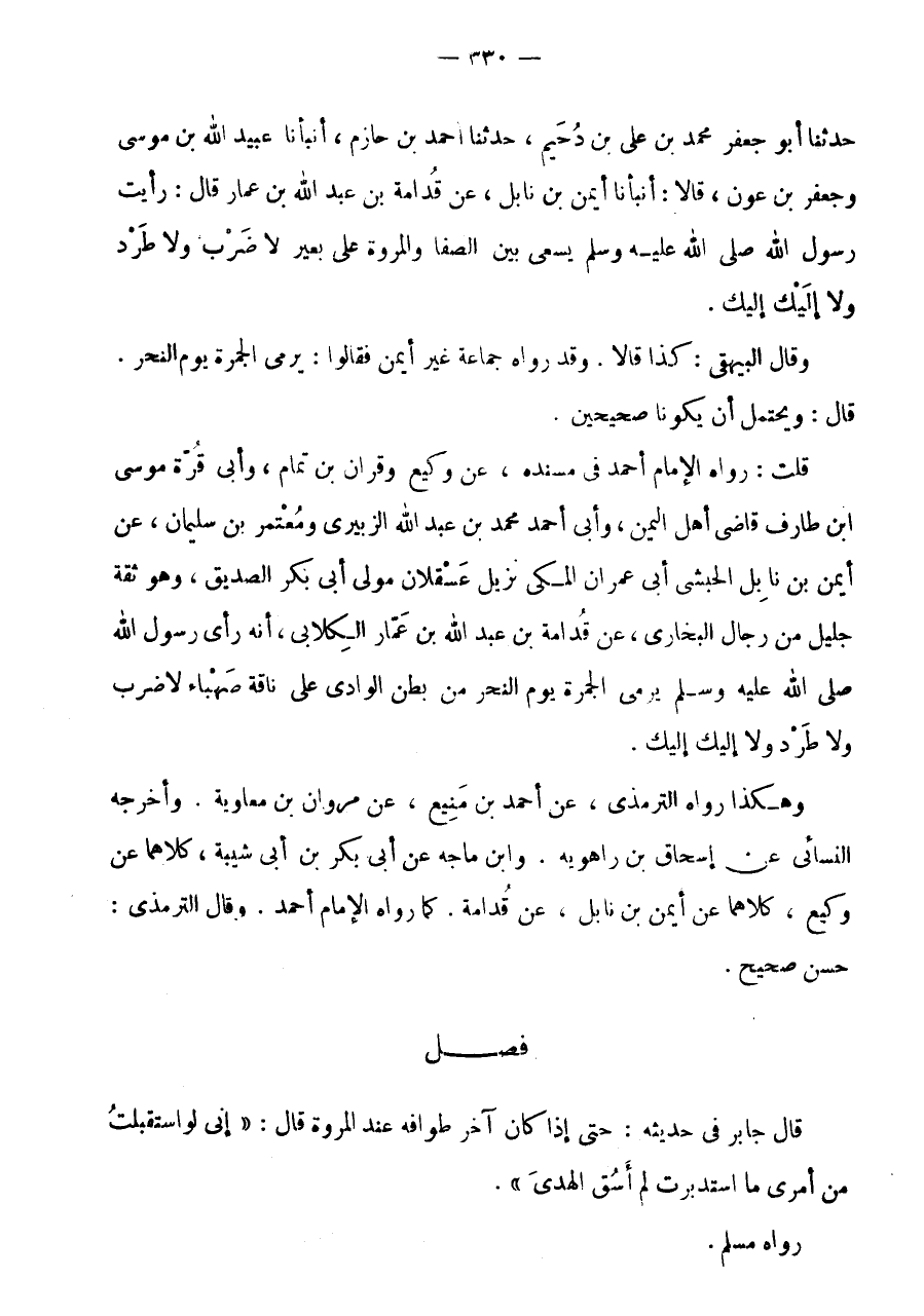 قُلْتُ: رَوَاهُ الْإِمَامُ أَحْمَدُ فِي مُسْنَدِهِ، عَنْ وَكِيعٍ وَقُرَّانَ بْنِ تَمام، وأبى قُرَّة مُوسَى ابْن طارف قَاضِي أَهْلِ الْيَمَنِ، وَأَبِي أَحْمَدَ مُحَمَّدِ بْنِ عَبْدِ اللَّهِ الزُّبَيْرِيِّ وَمُعْتَمِرِ بْنِ سُلَيْمَانَ، عَنْ أَيْمَنَ بْنِ نَابِلٍ الْحَبَشِيِّ أَبِي عِمْرَانَ الْمَكِّيِّ نَزِيلِ عَسْقَلَانَ مَوْلَى أَبِي بَكْرٍ الصِّدِّيقِ، وَهُوَ ثِقَةٌ جَلِيلٌ مِنْ رِجَالِ الْبُخَارِيِّ، عَنْ قُدَامَةَ بْنِ عَبْدِ اللَّهِ بْنِ عَمَّارٍ الْكِلَابِيِّ، أَنَّهُ رَأَى رَسُولُ اللَّهِ صَلَّى اللَّهُ عَلَيْهِ وَسَلَّمَ يَرْمِي الْجَمْرَةَ يَوْمَ النَّحْرِ مِنْ بَطْنِ الْوَادِي عَلَى نَاقَةٍ صَهْبَاءَ لَا ضَرْبٌ وَلَا طَرْدٌ وَلَا إِلَيْكَ إِلَيْكَ.