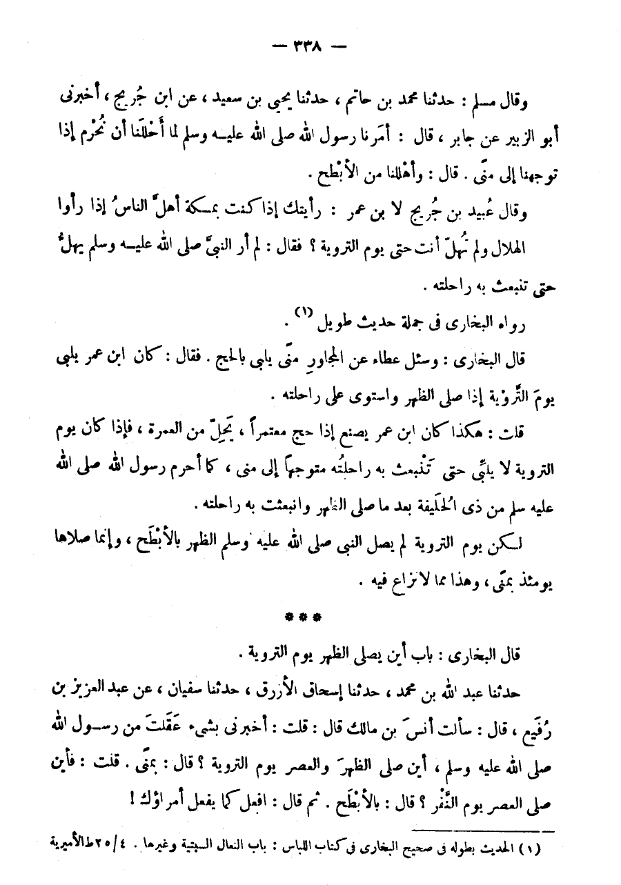 وَقَالَ مُسلم: حَدثنَا مُحَمَّد بن حَاتِم، حَدثنَا يَحْيَى بْنُ سَعِيدٍ، عَنِ ابْنِ جُرَيْجٍ، أَخْبَرَنِي أَبُو الزُّبَيْرِ عَنْ جَابِرٍ، قَالَ: أَمَرَنَا رَسُولُ اللَّهِ صَلَّى اللَّهُ عَلَيْهِ وَسَلَّمَ لَمَّا أَحْلَلْنَا أَنْ نُحْرِمَ إِذَا تَوَجَّهْنَا إِلَى مِنًى.