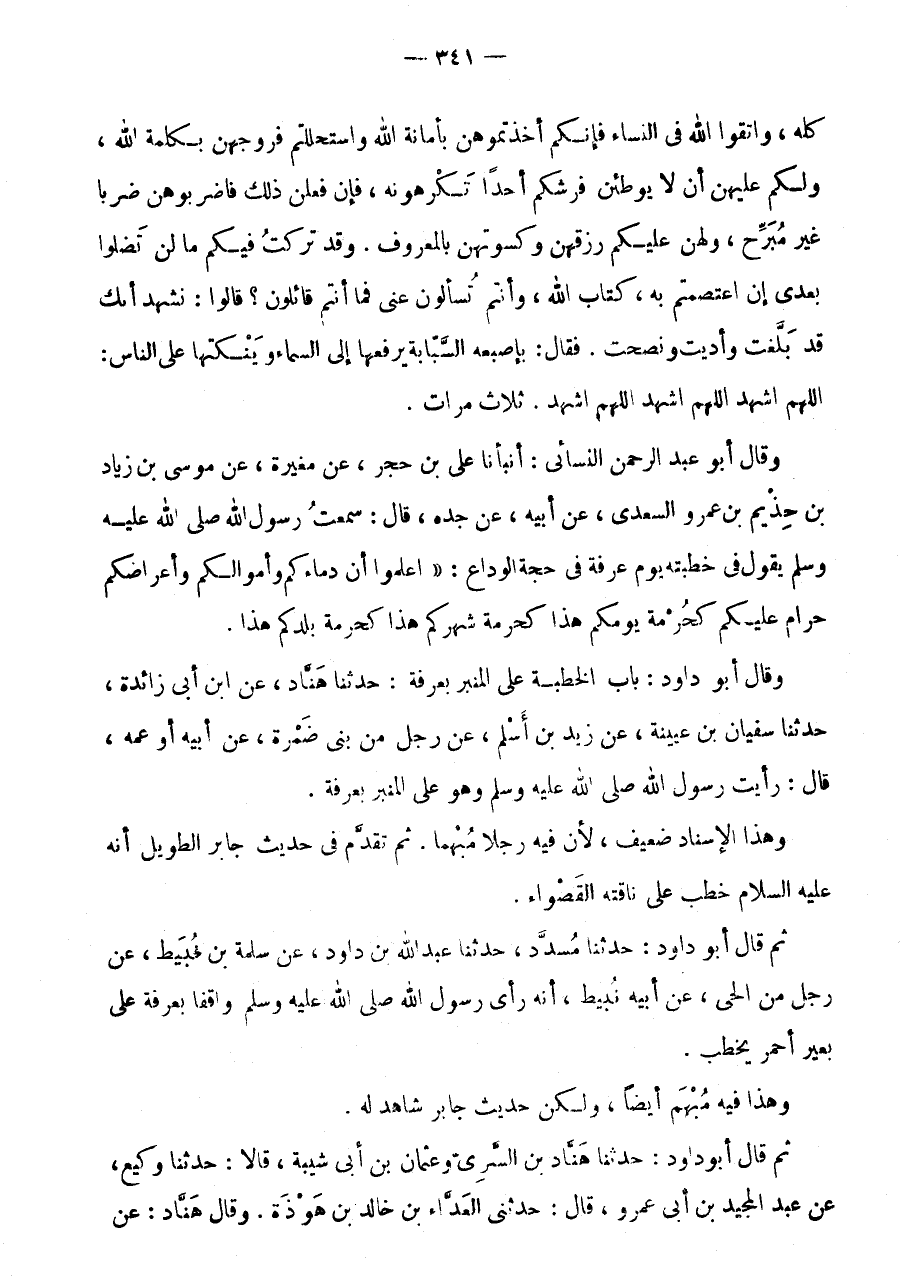وَقَالَ أَبُو دَاوُدَ: بَابُ الْخُطْبَةِ عَلَى الْمِنْبَرِ بِعَرَفَةَ: حَدَّثَنَا هناد، عَن ابْن أَبى زَائِدَة، حَدثنَا سُفْيَانَ بْنِ عُيَيْنَةَ، عَنْ زَيْدِ بْنِ أَسْلَمَ، عَنْ رَجُلٍ مِنْ بَنِي ضَمْرَةَ، عَنْ أَبِيهِ أَوْ عَمِّهِ، قَالَ: رَأَيْتُ رَسُولَ اللَّهِ صَلَّى اللَّهُ عَلَيْهِ وَسَلَّمَ وَهُوَ عَلَى الْمِنْبَرِ بِعَرَفَةَ.