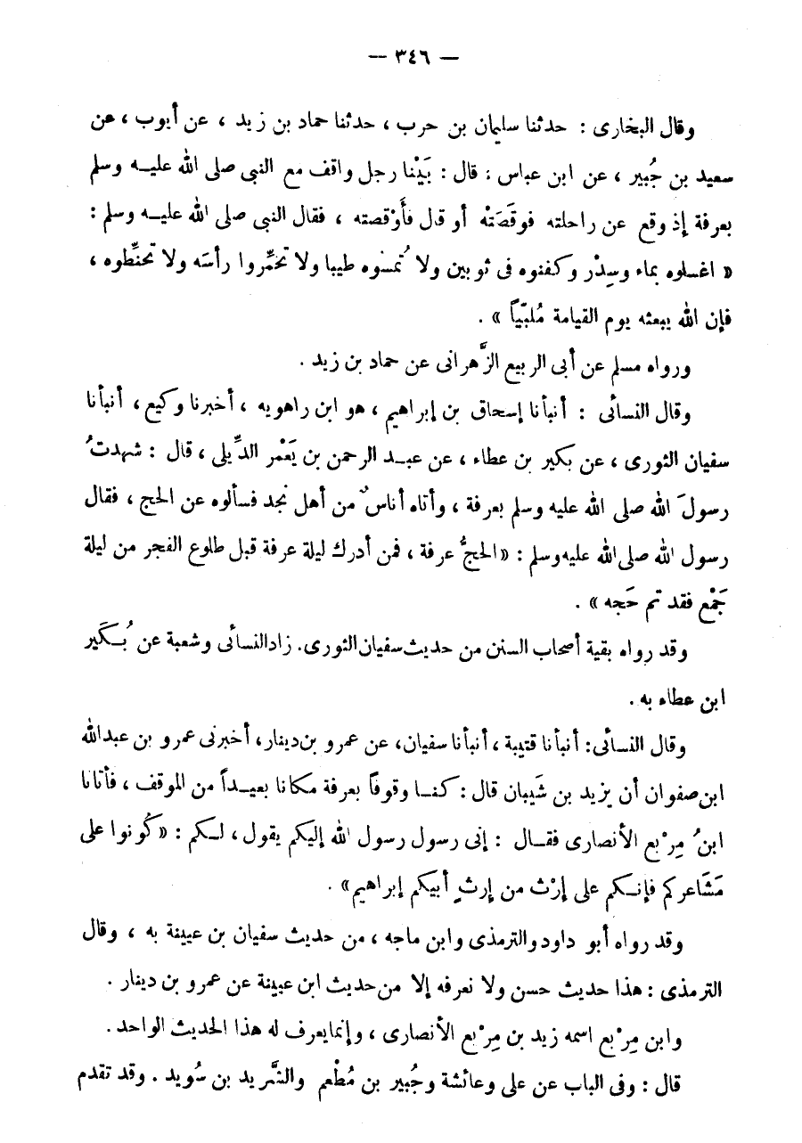 وَقَالَ الْبُخَارِيُّ: حَدَّثَنَا سُلَيْمَانُ بْنُ حَرْبٍ، حَدَّثَنَا حَمَّادُ بْنُ زَيْدٍ، عَنْ أَيُّوبَ، عَنْ سَعِيدِ بْنِ جُبَيْرٍ، عَنِ ابْنِ عَبَّاسٍ: قَالَ: بَيْنَا رَجُلٌ وَاقِفٌ مَعَ النَّبِيِّ صَلَّى اللَّهُ عَلَيْهِ وَسَلَّمَ بِعَرَفَةَ إِذْ وَقَعَ عَنْ رَاحِلَتِهِ فَوَقَصَتْهُ أَوْ قَالَ فَأَوْقَصَتْهُ، فَقَالَ النَّبِيُّ صَلَّى اللَّهُ عَلَيْهِ وَسَلَّمَ: " اغْسِلُوهُ بِمَاءٍ وَسِدْرٍ وَكَفِّنُوهُ فِي ثَوْبَيْنِ وَلَا تُمِسُّوهُ طِيبًا وَلَا تُخَمِّرُوا رَأْسَهُ وَلَا تُحَنِّطُوهُ، فَإِنَّ اللَّهَ يَبْعَثُهُ يَوْمَ الْقِيَامَةِ مُلَبِّيًا ".