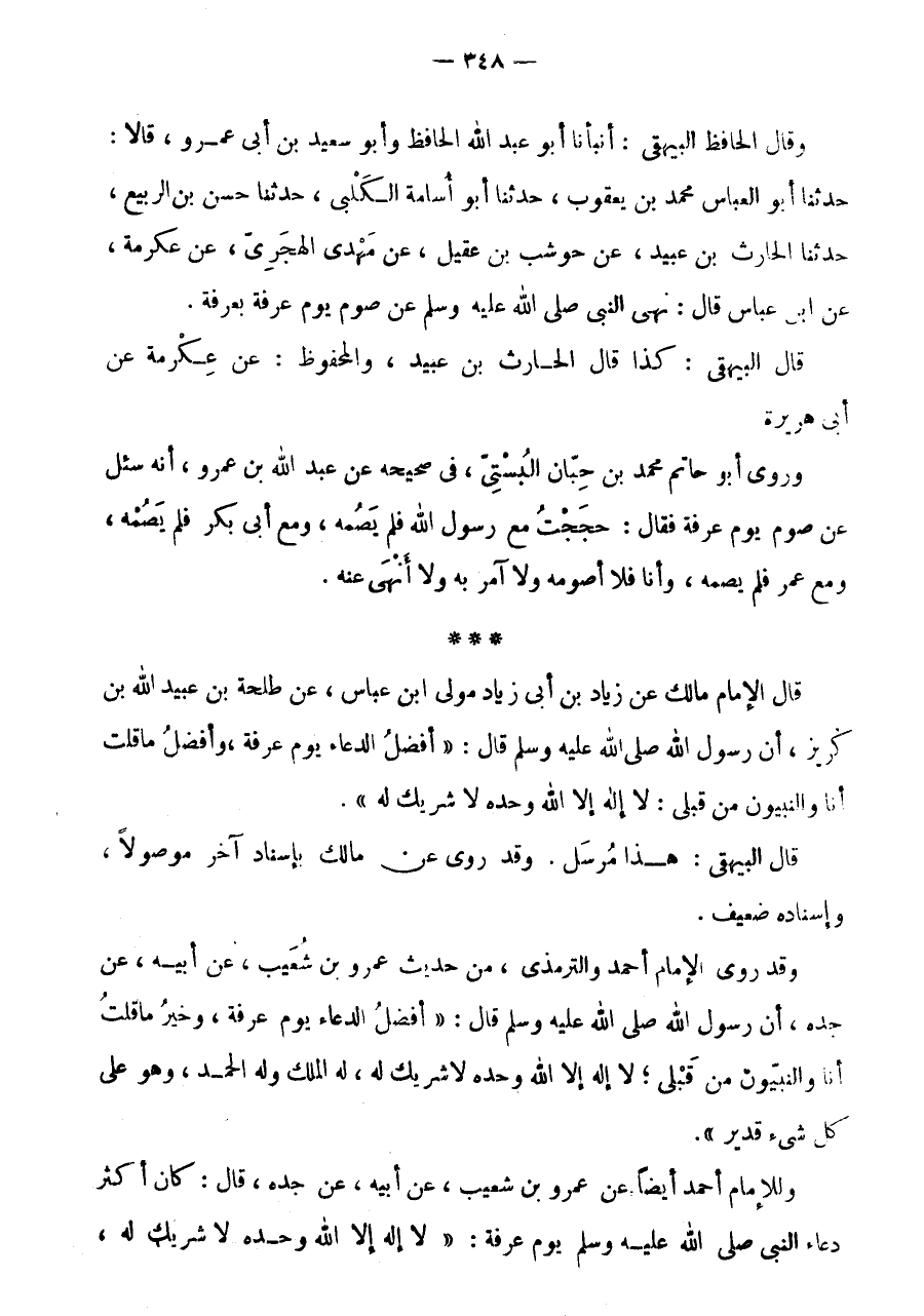 قَالَ الْبَيْهَقِيُّ: كَذَا قَالَ الْحَارِثُ بْنُ عُبَيْدٍ، وَالْمَحْفُوظُ: عَنْ عِكْرِمَةَ عَنْ أَبِي هُرَيْرَةَ وَرَوَى أَبُو حَاتِمٍ مُحَمَّدُ بْنُ حِبَّانَ الْبُسْتِيُّ، فِي صَحِيحِهِ عَنْ عَبْدِ اللَّهِ بْنِ عَمْرِو، أَنَّهُ سُئِلَ عَنْ صَوْمِ يَوْمِ عَرَفَةَ فَقَالَ: حججْت مَعَ رَسُول الله فَلَمْ يَصُمْهُ، وَمَعَ أَبِي بَكْرٍ فَلَمْ يَصُمْهُ، وَمَعَ عُمَرَ فَلَمْ يَصُمْهُ، وَأَنَا فَلَا أَصُومُهُ وَلَا آمُرُ بِهِ وَلَا أَنْهَى عَنْهُ.
