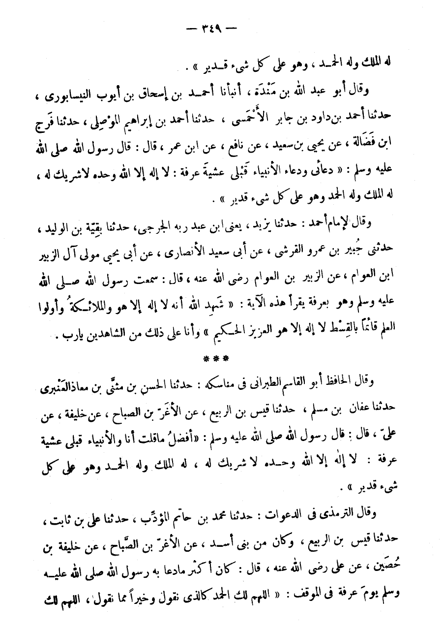 * * * وَقَالَ الْحَافِظُ أَبُو الْقَاسِمِ الطَّبَرَانِيُّ فِي مَنَاسِكِهِ: حَدثنَا الْحسن بن مثنى بن معَاذ الْعَنْبَري حَدثنَا عَفَّان بن مُسلم، حَدثنَا قَيْسُ بْنُ الرَّبِيعِ، عَنِ الْأَغَرِّ بْنِ الصَّبَّاحِ، عَنْ خَلِيفَةَ، عَنْ عَلِيٍّ، قَالَ: قَالَ رَسُولُ اللَّهِ صَلَّى اللَّهُ عَلَيْهِ وَسَلَّمَ: " أَفْضَلُ مَا قُلْتُ أَنَا وَالْأَنْبِيَاءُ قَبْلِي عَشِيَّةَ عَرَفَةَ: لَا إِلَهَ إِلَّا اللَّهُ وَحْدَهُ لَا شَرِيكَ لَهُ، لَهُ الْمُلْكُ وَلَهُ الْحَمْدُ وَهُوَ عَلَى كُلِّ شئ قدير ".