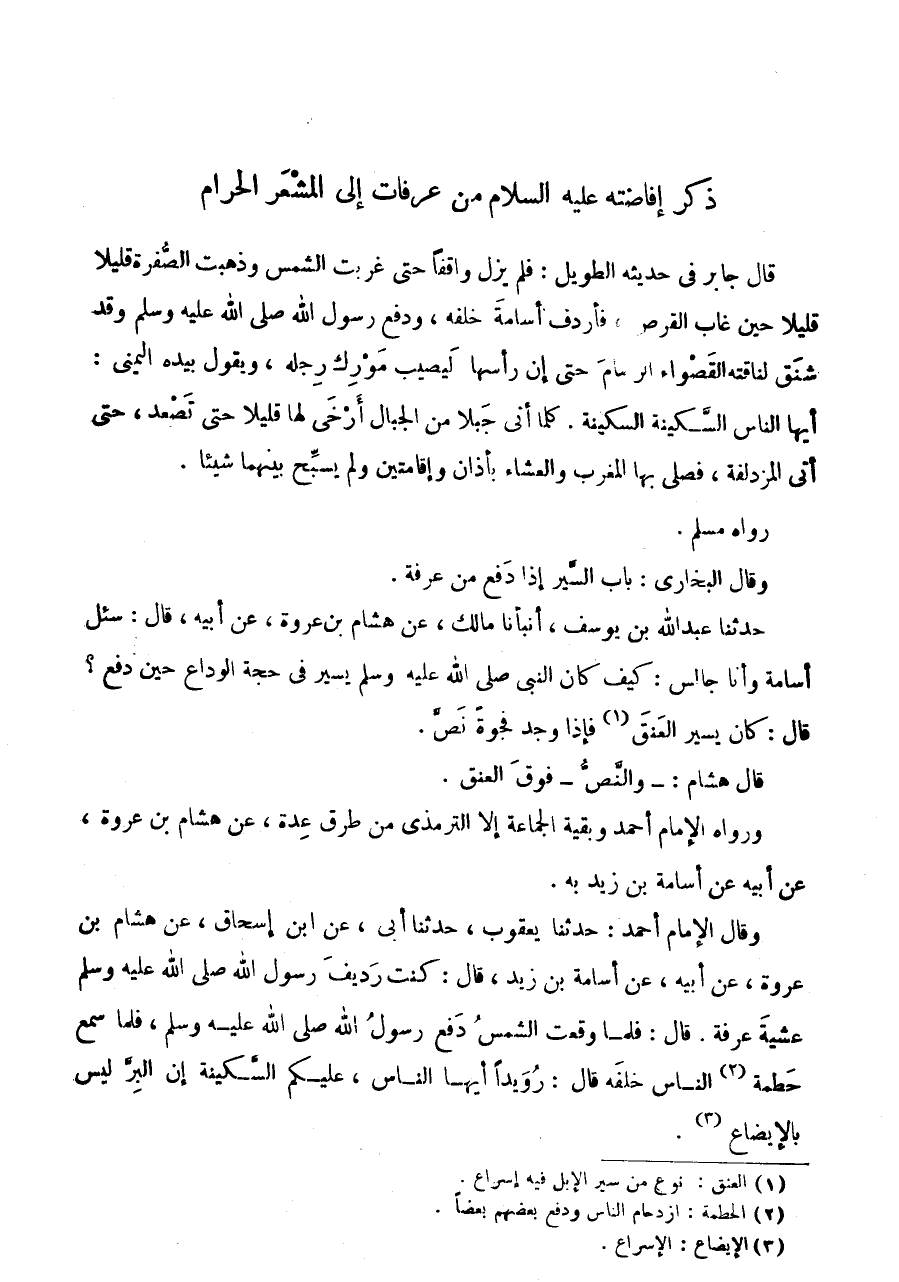 قَالَ: فَلَمَّا وَقَعَتِ الشَّمْسُ دَفَعَ رَسُولُ اللَّهِ صَلَّى اللَّهُ عَلَيْهِ وَسَلَّمَ، فَلَمَّا سَمِعَ حَطْمَةَ (2) النَّاسِ خَلْفَهُ قَالَ: رُوَيْدًا أَيُّهَا النَّاسُ، عَلَيْكُمُ السكينَة إِن الْبر لَيْسَ بالايضاع (3) .