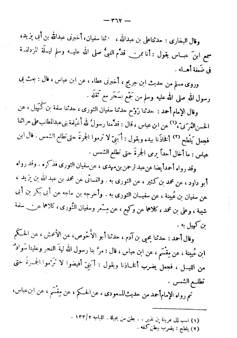 الْحسن العرني، (1) عَن ابْن عَبَّاس، قَالَ: قدمنَا رَسُول الله أغيلمة بنى عبد الْمطلب على حراثنا فَجَعَلَ يَلْطَحُ (2) أَفْخَاذَنَا بِيَدِهِ وَيَقُولُ: أَبَنِيَّ لَا تَرْمُوا الْجَمْرَةَ حَتَّى تَطْلُعَ الشَّمْسُ.