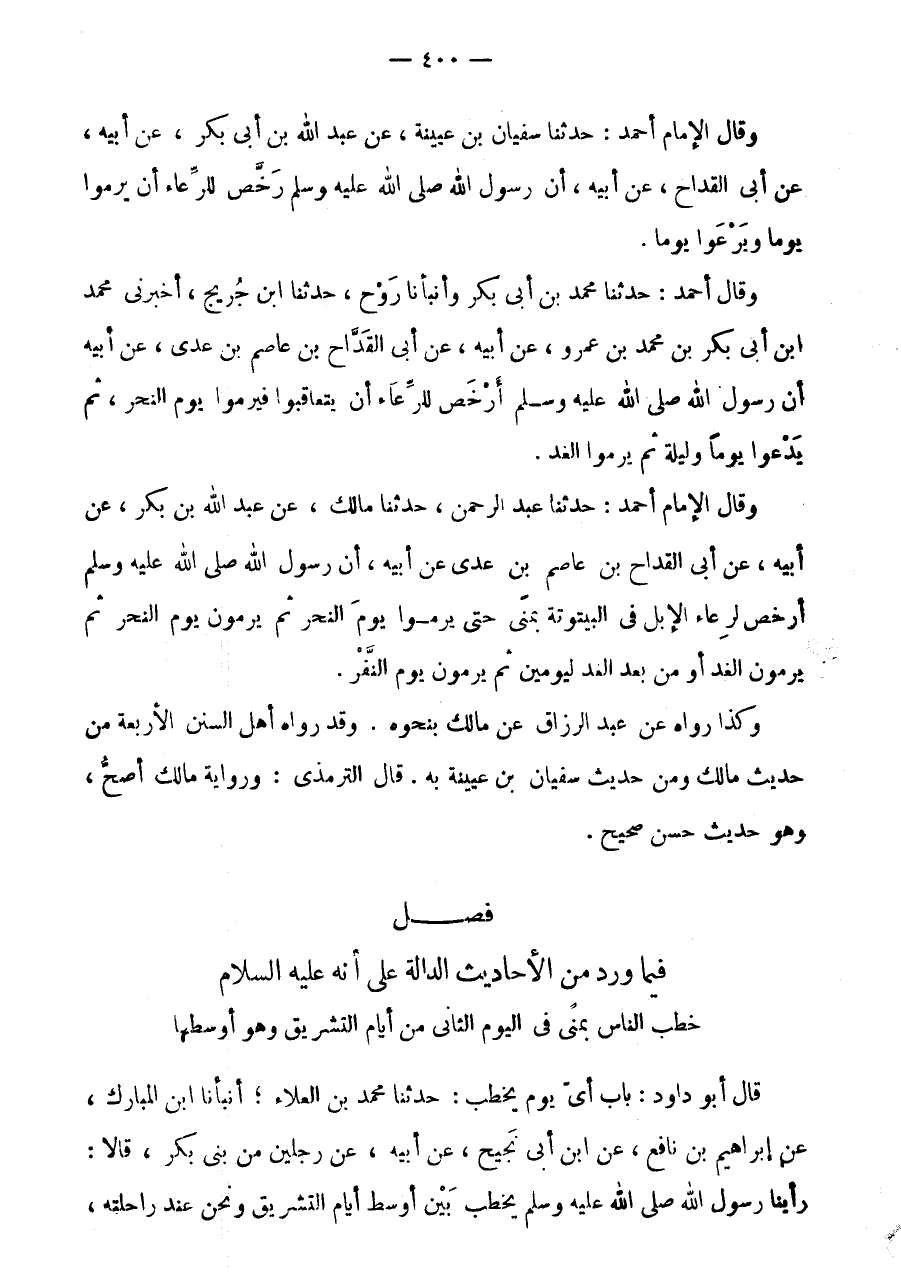 فَصْلٌ فِيمَا وَرَدَ مِنَ الْأَحَادِيثِ الدَّالَّةِ عَلَى أَنَّهُ عَلَيْهِ السَّلَامُ خَطَبَ النَّاسَ بِمِنًى فِي الْيَوْمِ الثَّانِي مِنْ أَيَّامِ التَّشْرِيقِ وَهُوَ أَوْسَطُهَا قَالَ أَبُو دَاوُدَ: بَابٌ أَيَّ يَوْمٍ يَخْطُبُ: حَدَّثَنَا مُحَمَّدُ بْنُ الْعَلَاءِ، أَنْبَأَنَا ابْنُ الْمُبَارَكِ، عَنْ إِبْرَاهِيمُ بْنُ نَافِعٍ، عَنِ ابْنِ أَبِي نَجِيحٍ، عَنْ أَبِيهِ، عَنْ رَجُلَيْنِ مِنْ بَنِي بَكْرٍ، قَالَا: رَأَيْنَا رَسُولَ اللَّهِ صَلَّى اللَّهُ عَلَيْهِ وَسَلَّمَ يَخْطُبُ بَيْنَ أَوْسَطِ أَيَّامِ التَّشْرِيقِ وَنَحْنُ عِنْدَ رَاحِلَتِهِ،