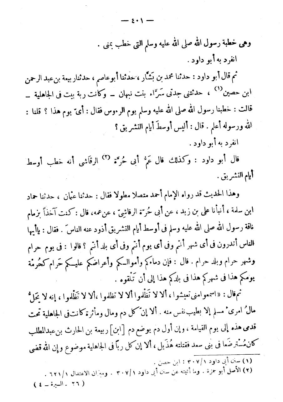 أَلَا إِنَّ كُلَّ دَمٍ وَمَالٍ وَمَأْثُرَةٍ كَانَتْ فِي الْجَاهِلِيَّةِ تَحْتَ قَدَمِي هَذِهِ إِلَى يَوْمِ الْقِيَامَةِ، وَإِنَّ أَوَّلَ دَمٍ يوضع دم [ابْن] رَبِيعَةَ بْنِ الْحَارِثِ بْنِ عَبْدِ الْمُطَّلِبِ كَانَ مسترضعا فِي بنى سعد فَقتلته هُذَيْل، أَلا إِن كل رَبًّا فِي الْجَاهِلِيَّة مَوْضُوع وَإِن الله قضى