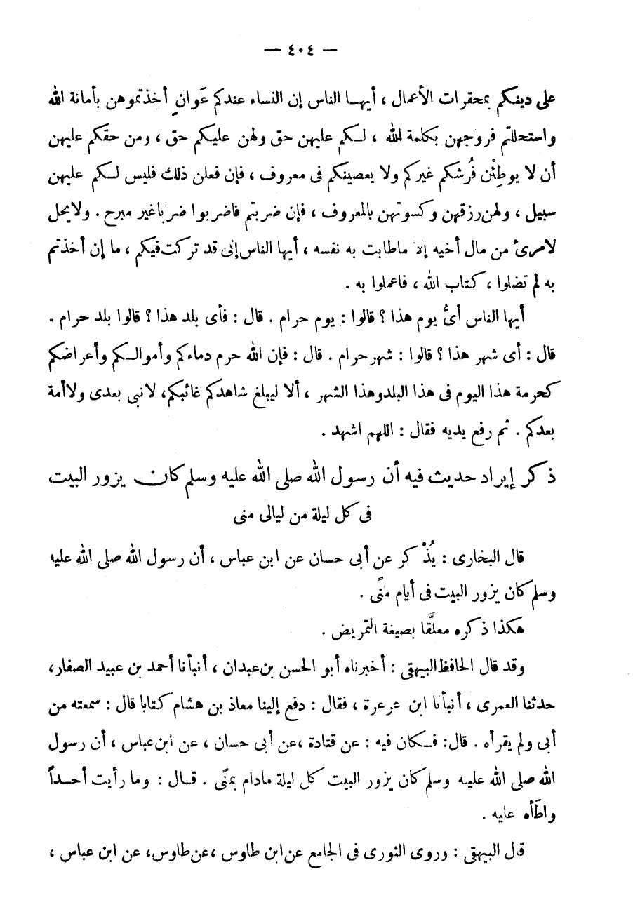 قَالَ الْبُخَارِيُّ: يُذْكَرُ عَنْ أَبِي حَسَّانَ عَنِ ابْنِ عَبَّاسٍ، أَنَّ رَسُولَ اللَّهِ صَلَّى اللَّهُ عَلَيْهِ وَسَلَّمَ كَانَ يَزُورُ الْبَيْتَ فِي أَيَّامِ مِنًى.