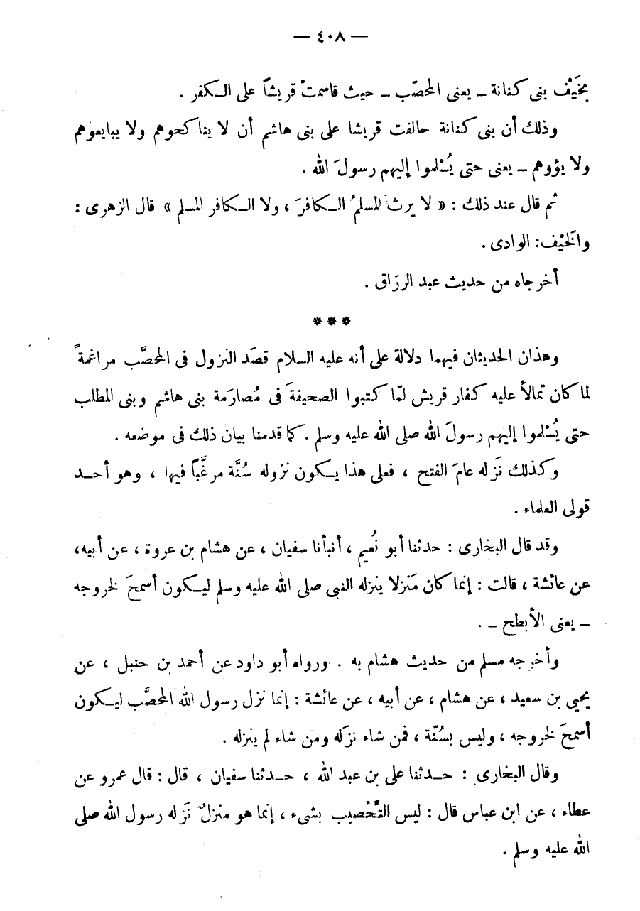 ثُمَّ قَالَ عِنْدَ ذَلِكَ: " لَا يَرِثُ الْمُسْلِمُ الْكَافِرَ، وَلَا الْكَافِرُ الْمُسْلِمَ " قَالَ الزُّهْرِيُّ: وَالْخَيْفُ: الْوَادِي.